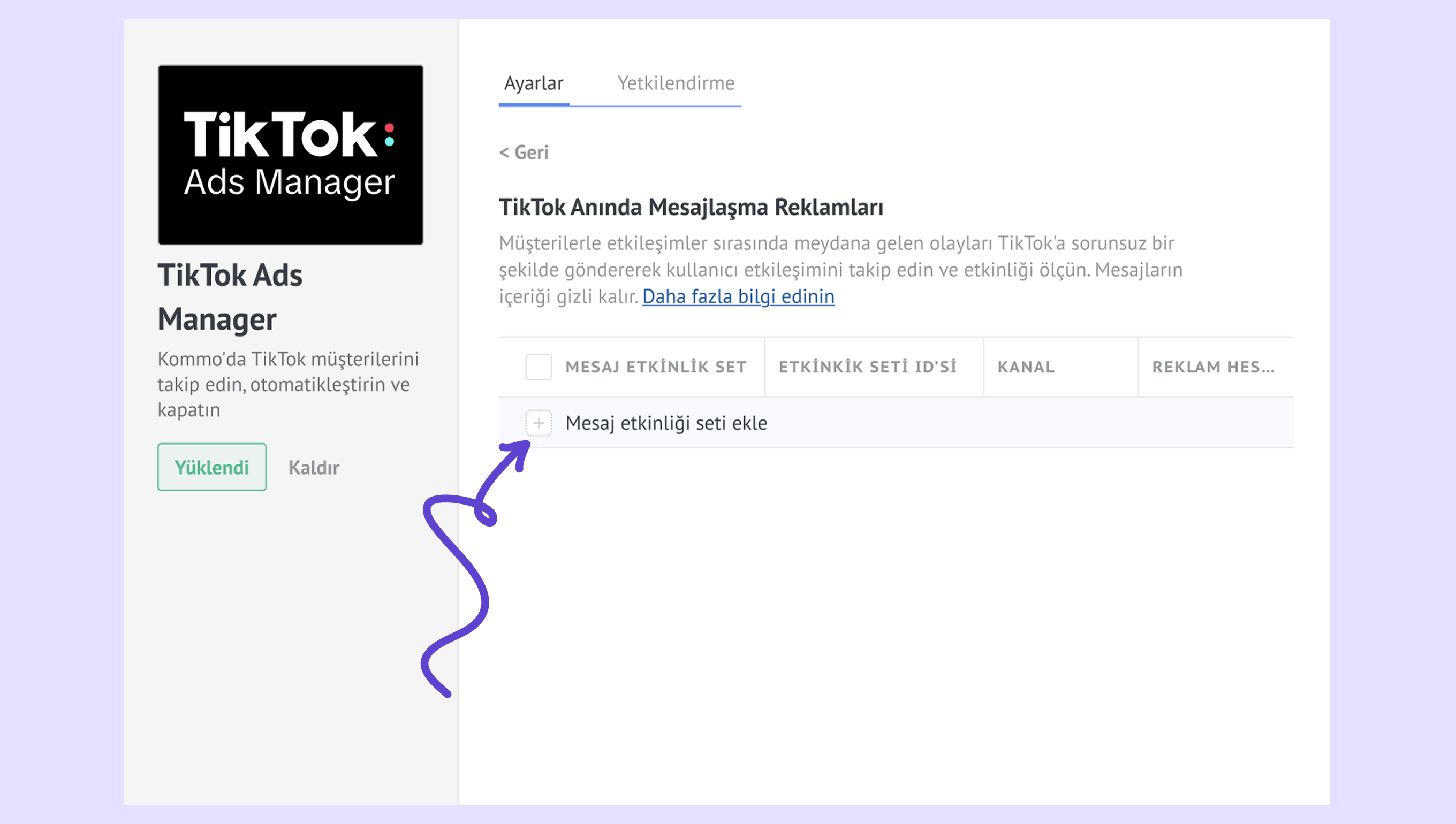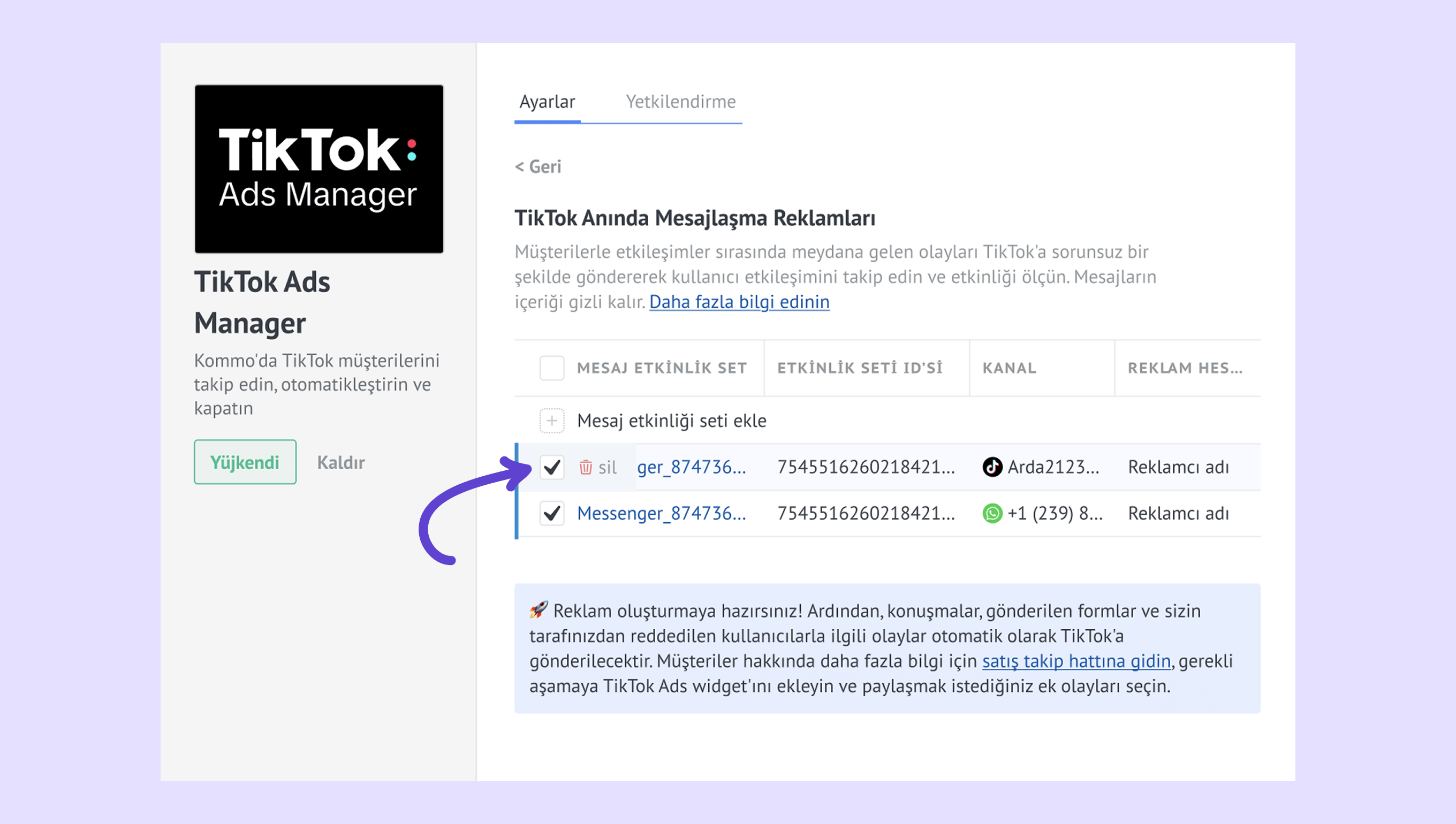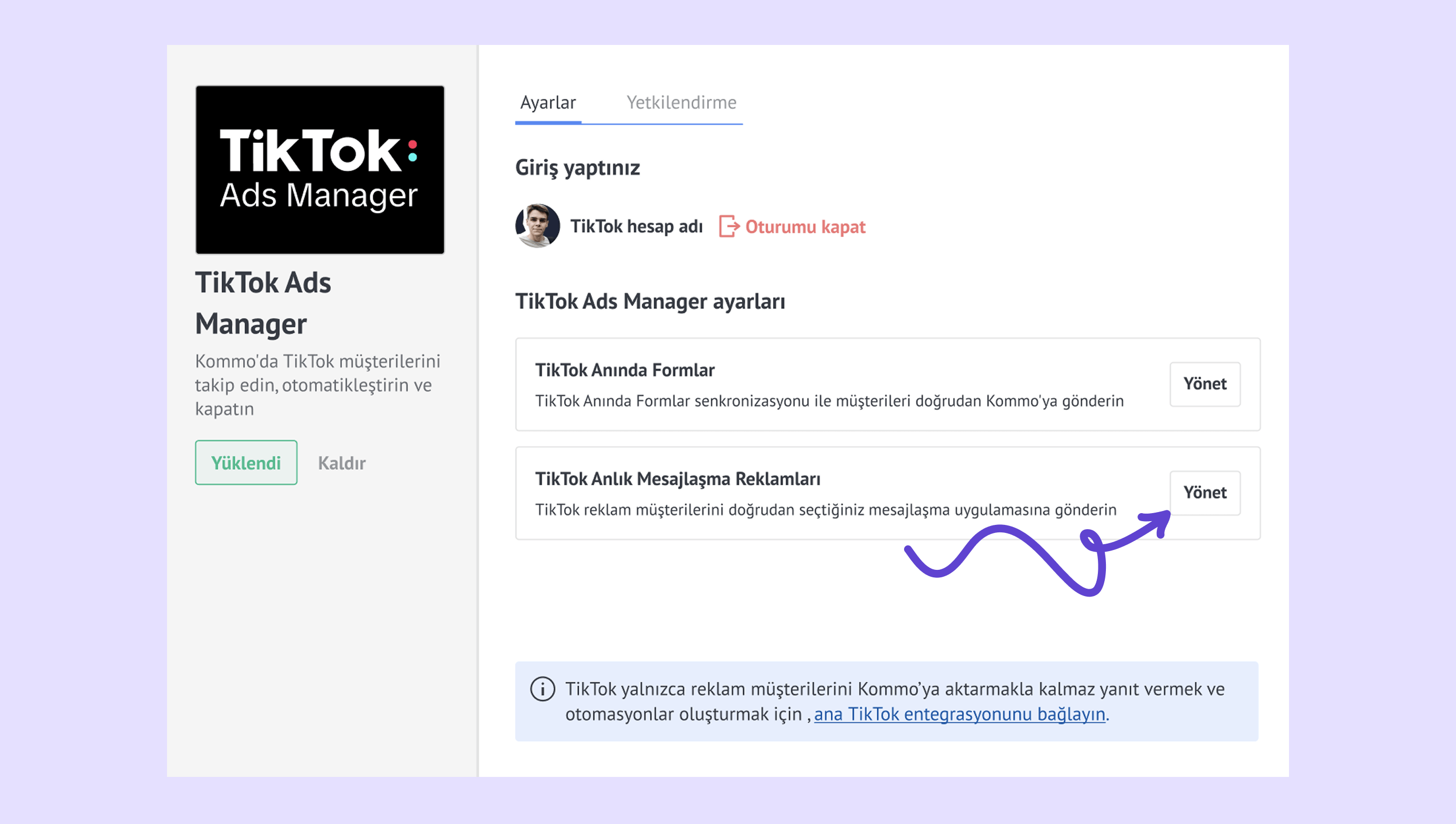 Not: Mesajlarınız senkronize edilmiyorsa, TikTok Ads Manager entegrasyonunuzu yeniden yetkilendirmeyi deneyin.
