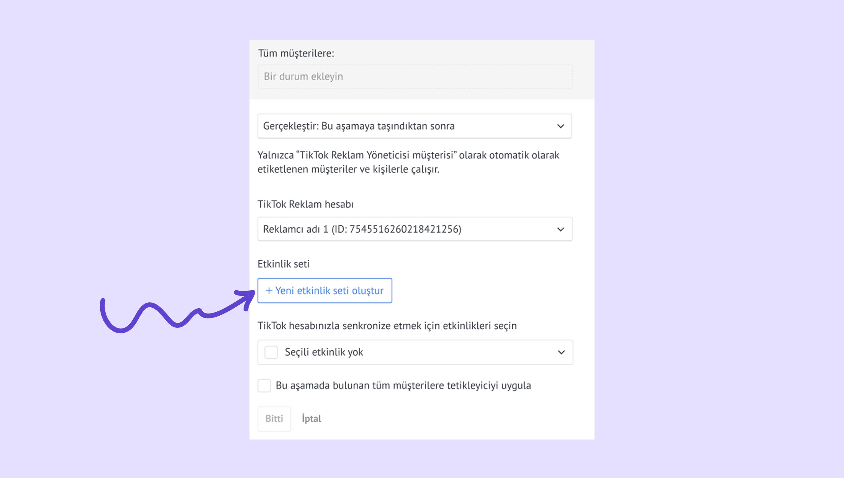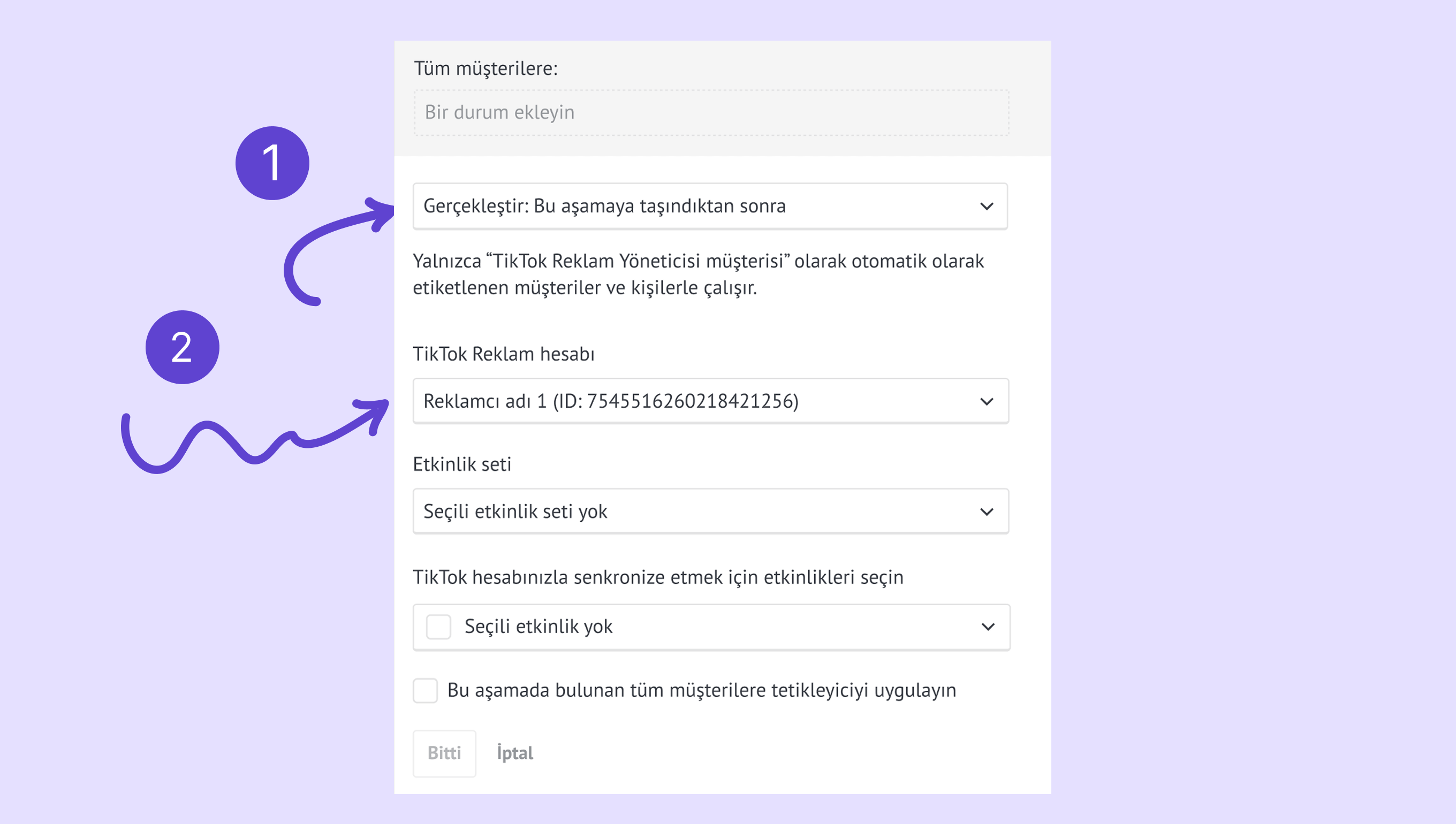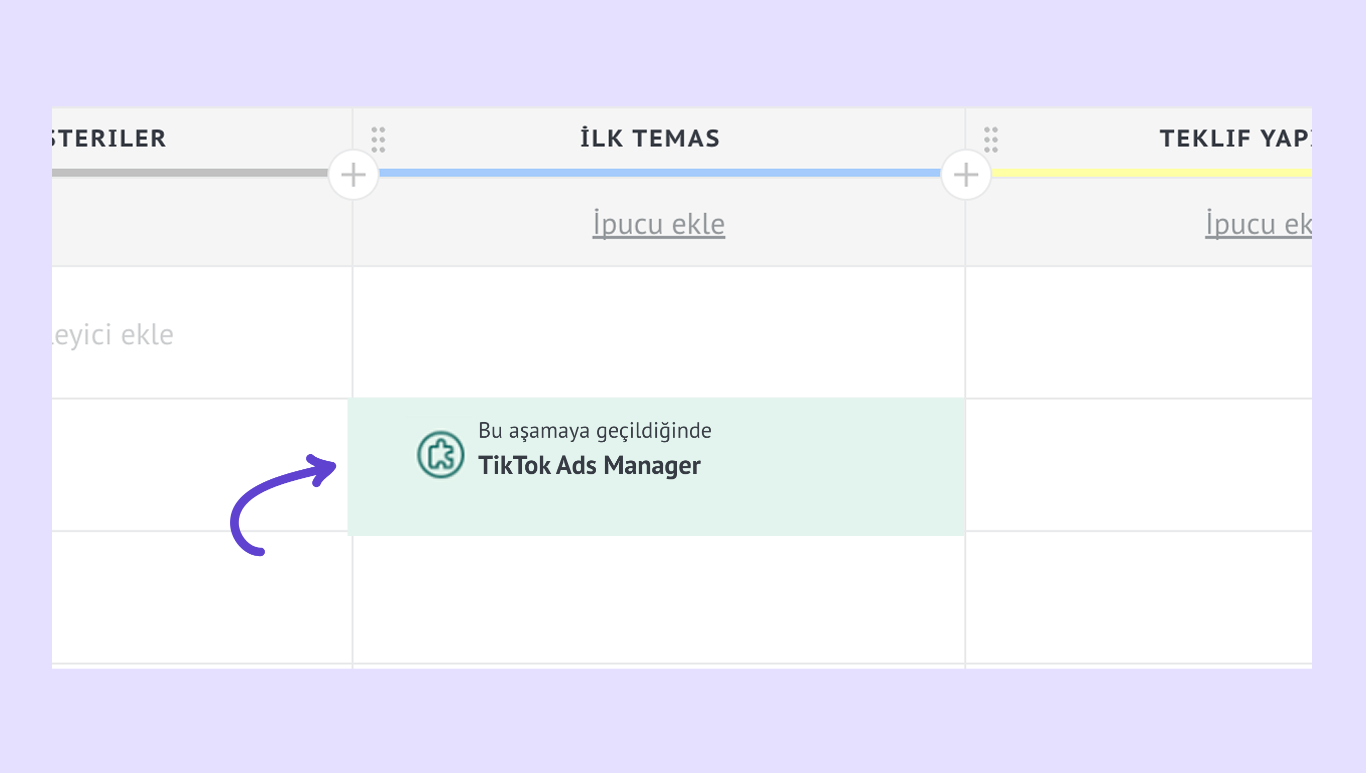 Dijital satış takip hattınızdaki tetikleyicileri kullanarak etkinlikleri TikTok'a otomatik olarak gönderebilirsiniz. Bu, Kommo ve TikTok arasında daha fazla eylemin senkronize edilmesine yardımcı olarak reklam takibi ve performansını iyileştirir.