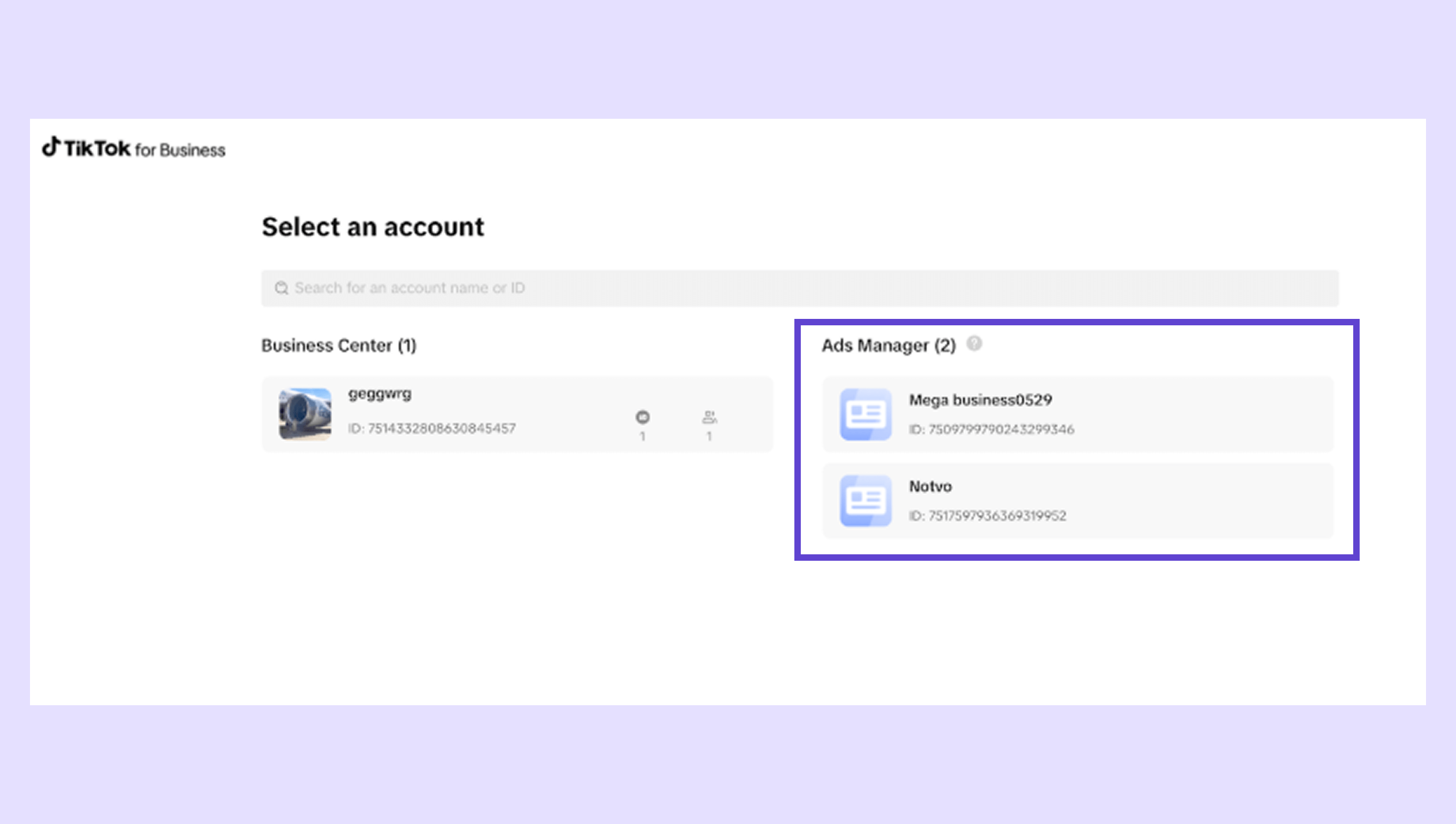 TikTok Reklam Yöneticisi'ne giriş yapın ve reklamlar için kullanacağınız TikTok for Business hesabını seçin.