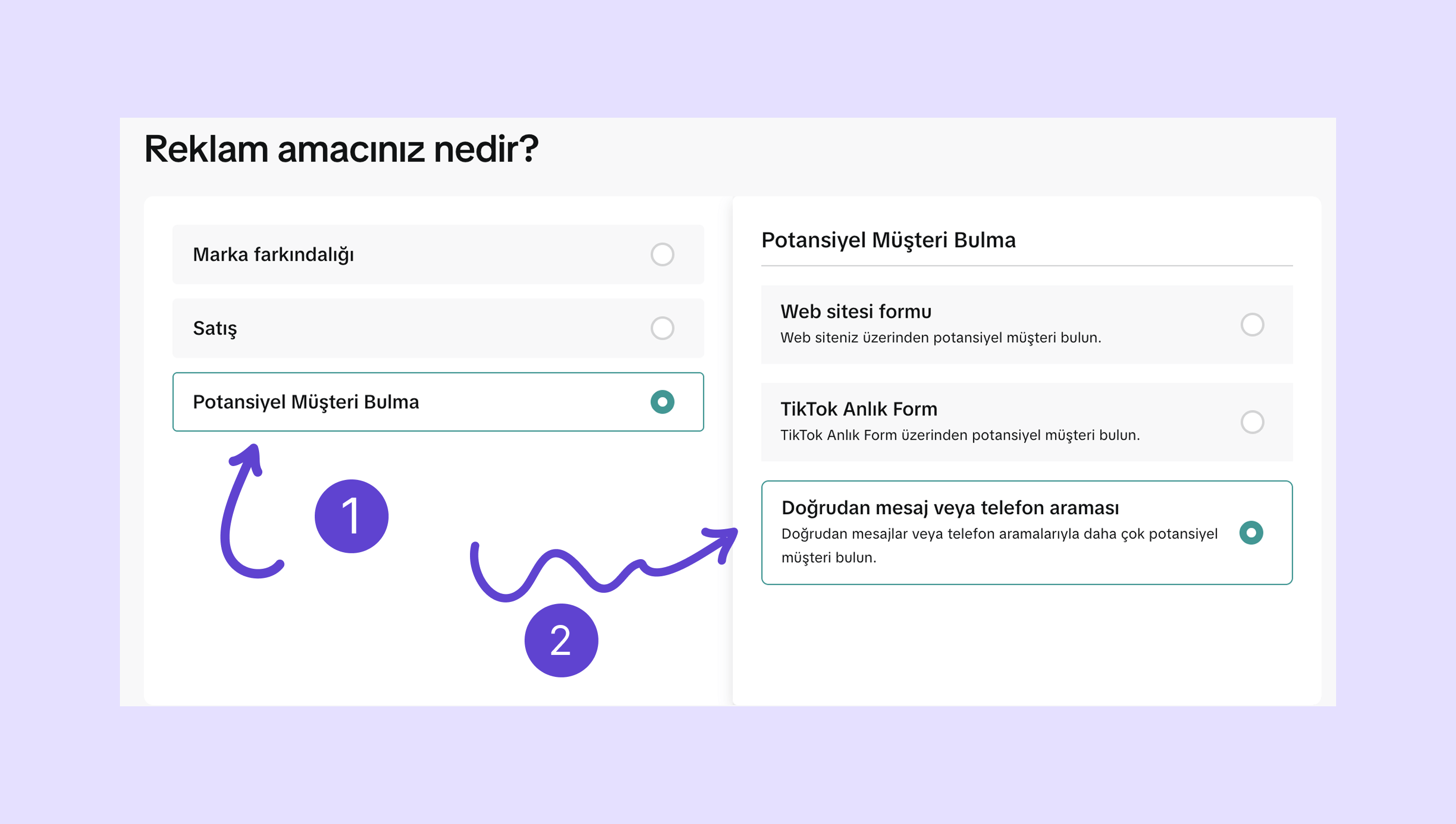 Kampanya hedefiniz olarak Potansiyel müşteri oluşturma’yı seçin, ardından kampanya türü olarak Doğrudan mesajlar veya Telefon görüşmeleri’ni seçin.