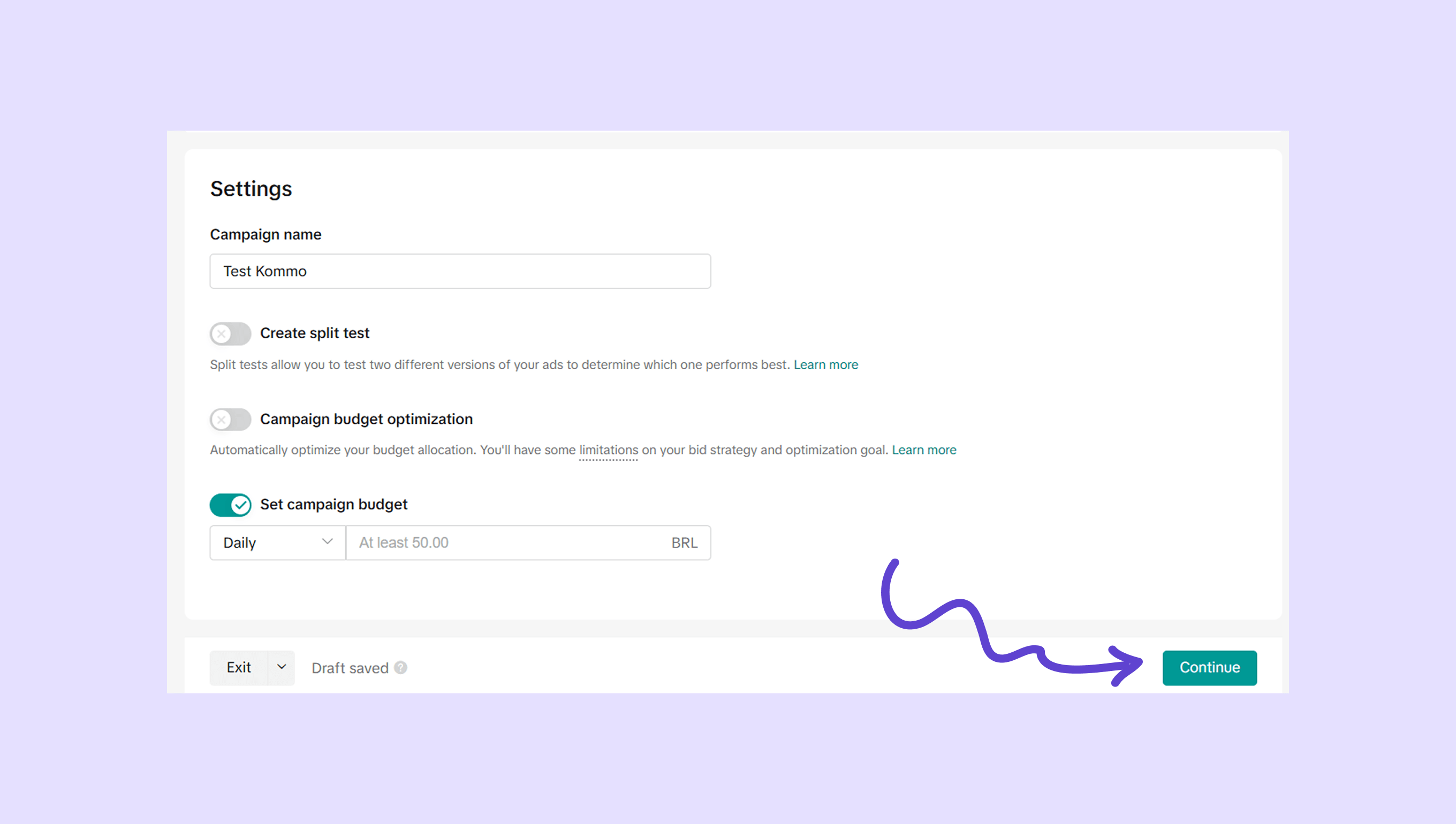Aşağı kaydırın, kampanyanızın adını girin ve (Manuel Kampanya kullanıyorsanız) bütçenizi belirleyin. Devam'a tıklayın.