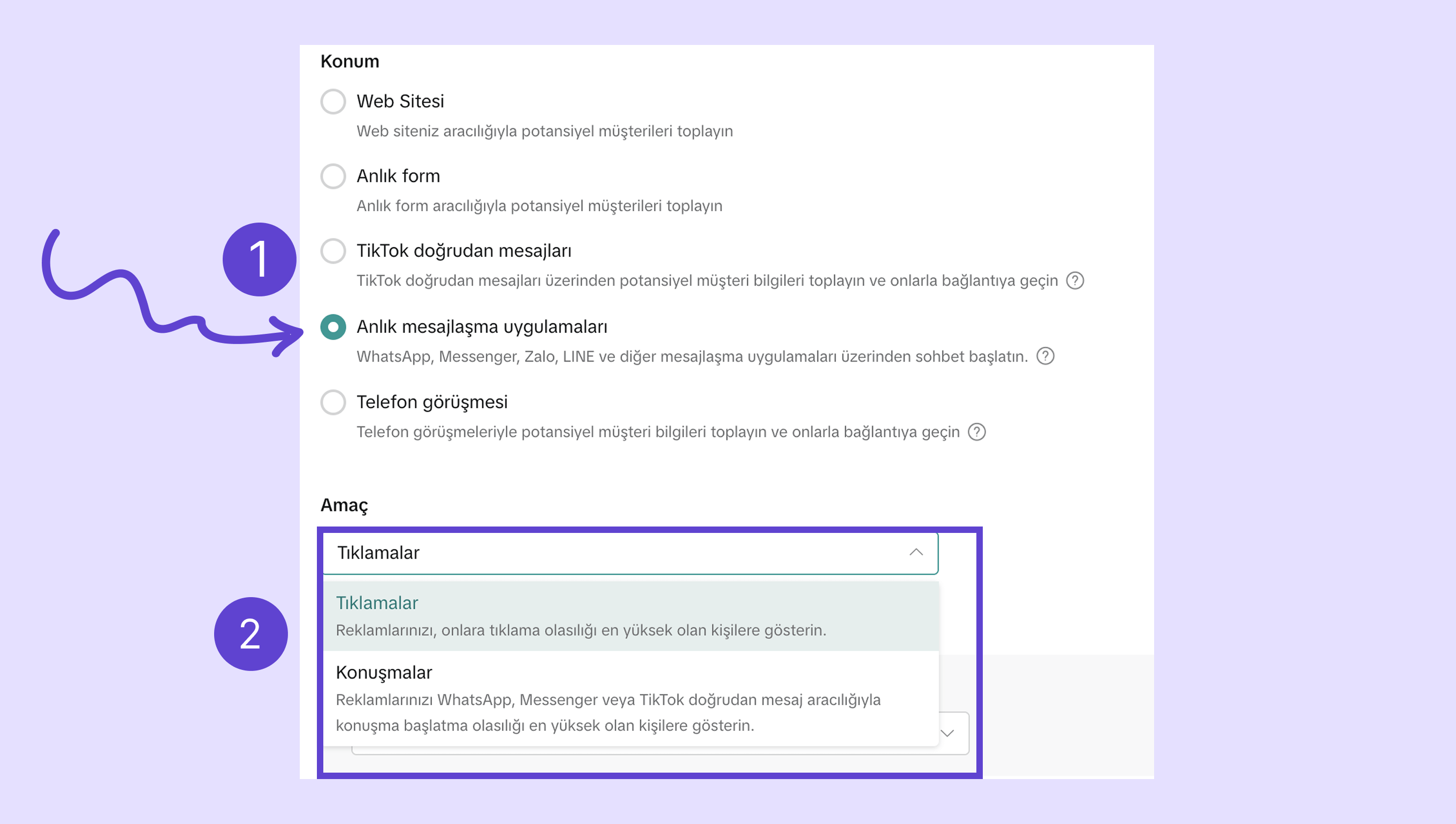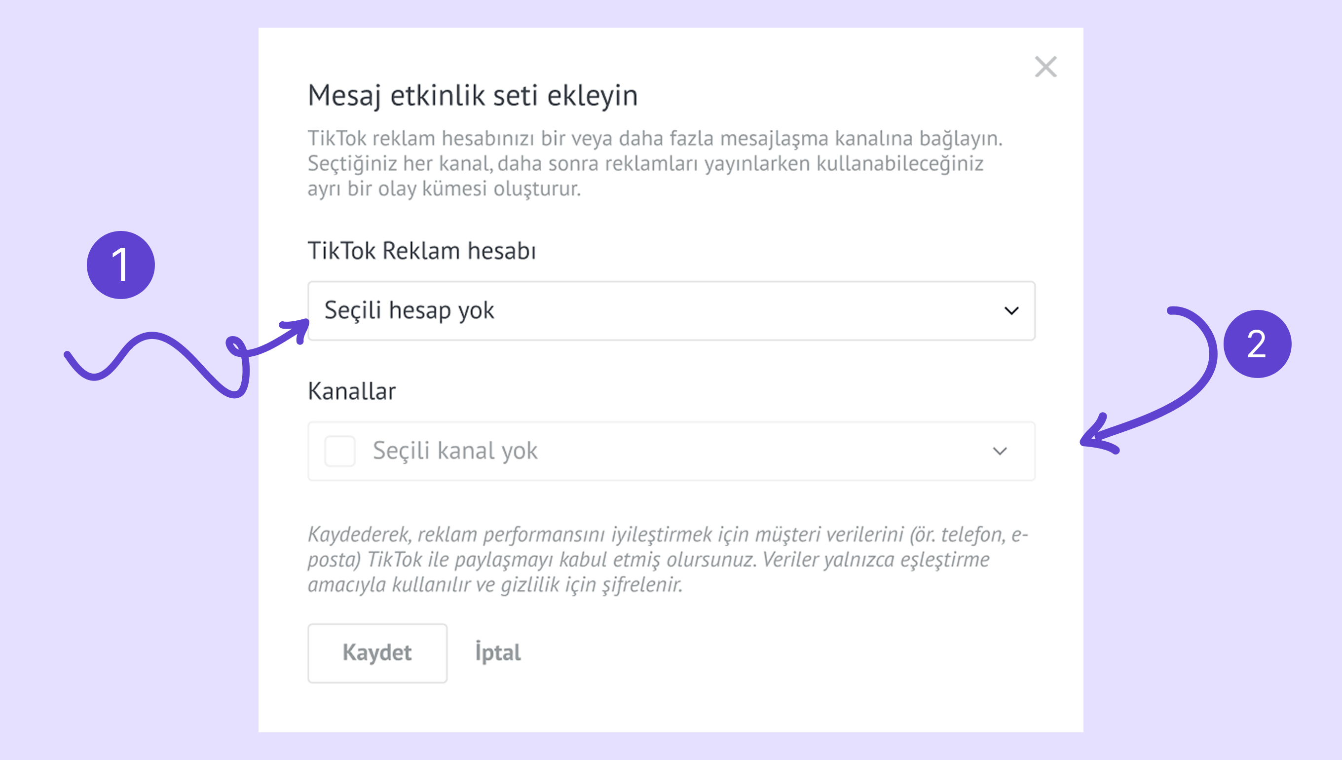 Bir etkinlik seti, TikTok Ads hesabınızı belirli bir mesajlaşma kanalına (WhatsApp, Facebook Messenger veya TikTok gibi) bağlar. Reklamınızı tıkladıktan sonra potansiyel müşterilerin nereye yönlendirileceğini belirler ve TikTok'un reklam hedefleme ve performansını iyileştirmek için sohbet başlatma, sipariş verme veya ödeme tamamlama gibi önemli eylemleri izlemesine yardımcı olur.