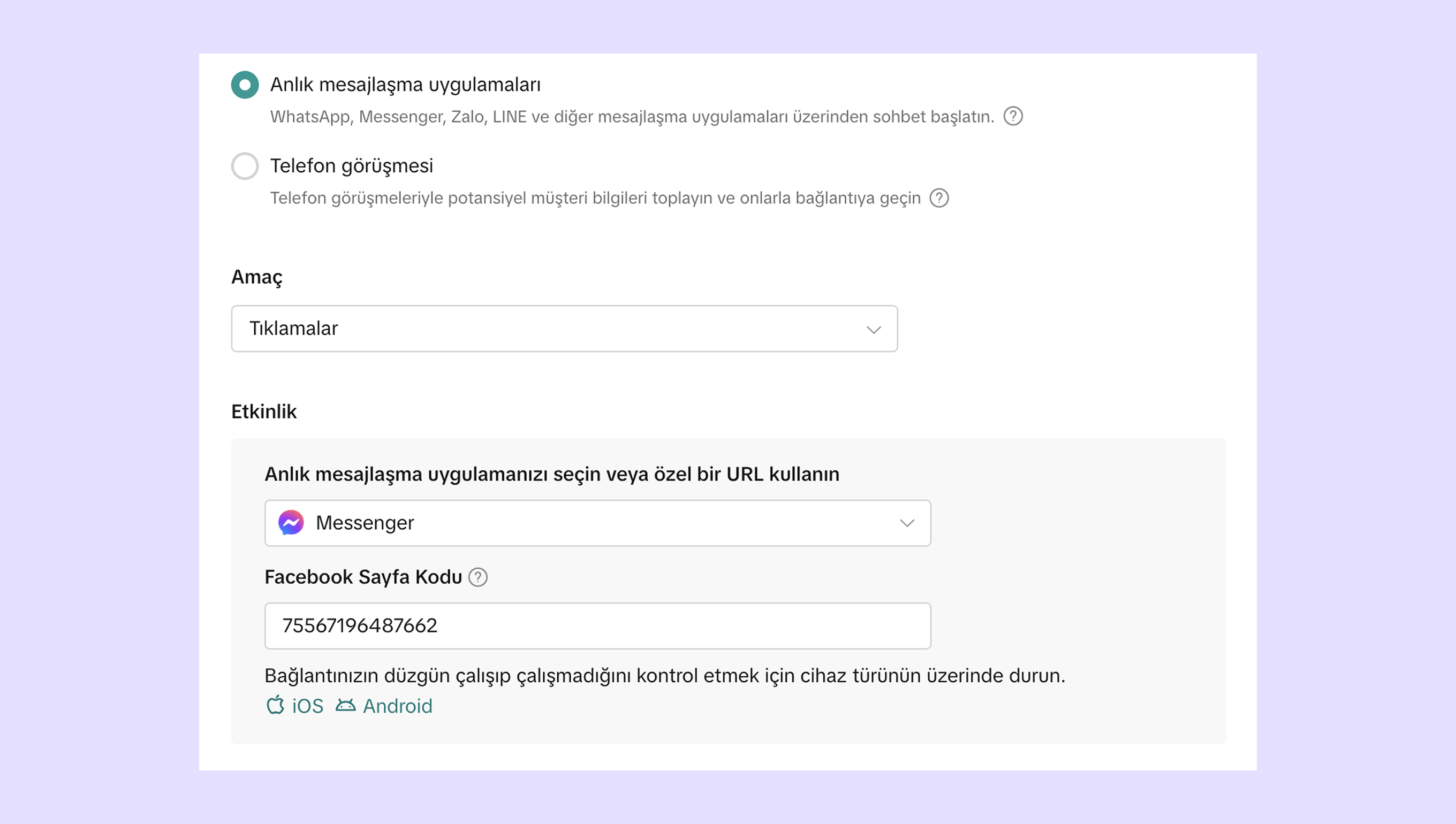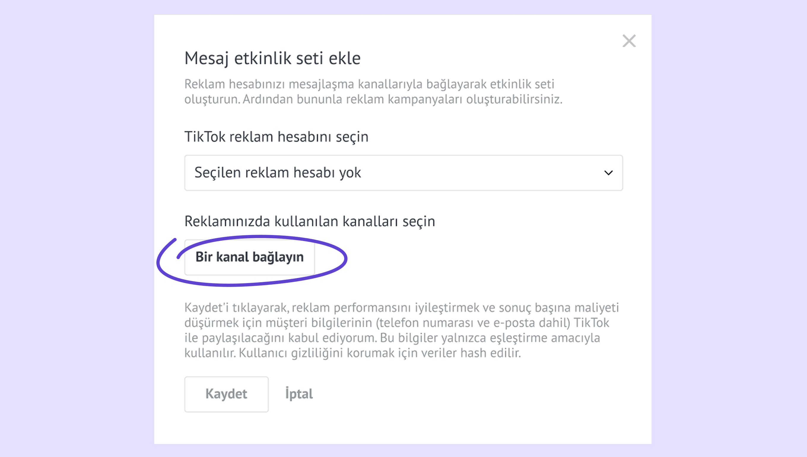 Bir reklam hesabı seçin, ardından bağlanmak istediğiniz mesajlaşma kanalını seçin. Bu kanal, kullanıcıların reklamınızı tıkladıklarında size mesaj gönderecekleri yerdir.