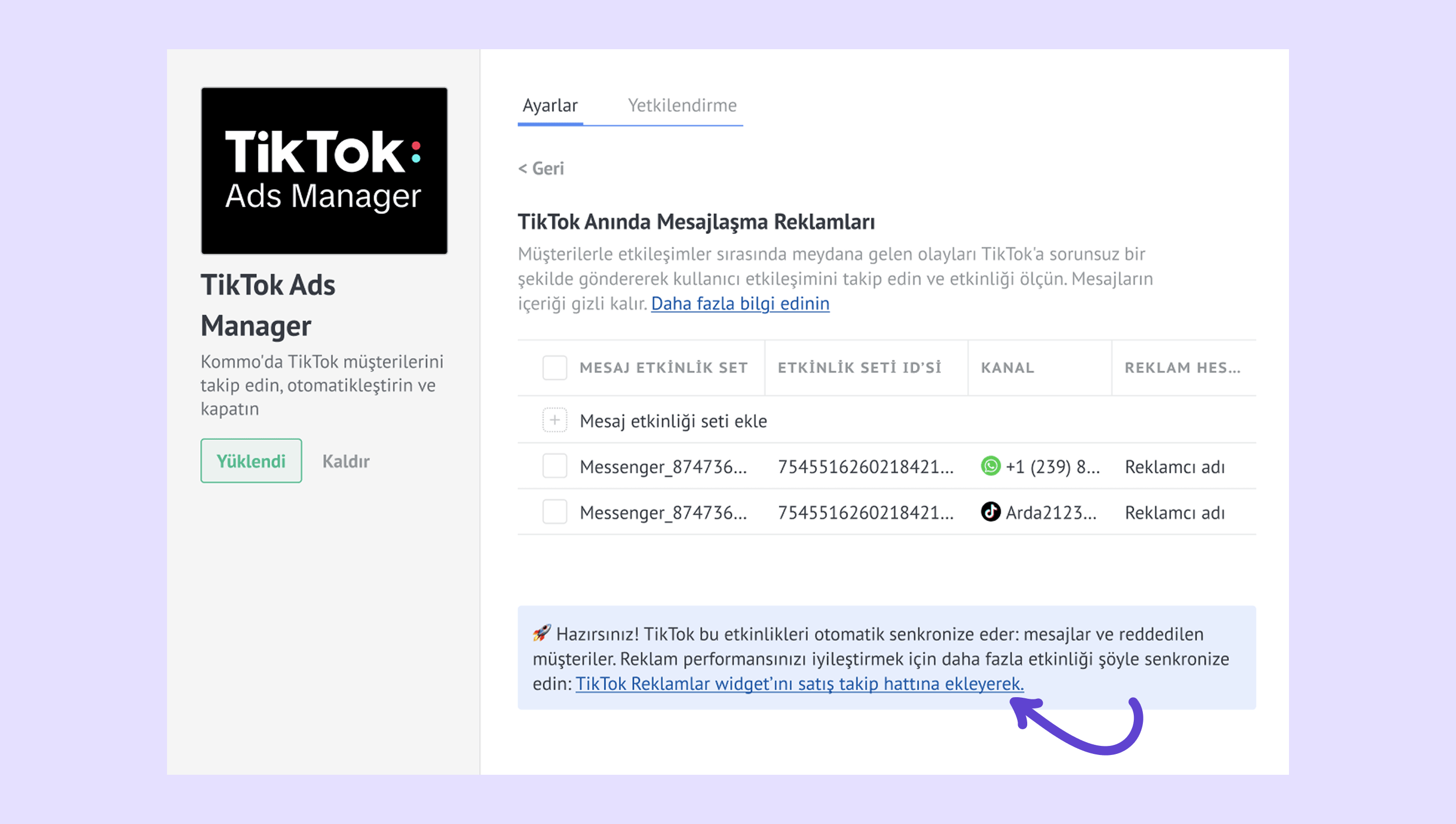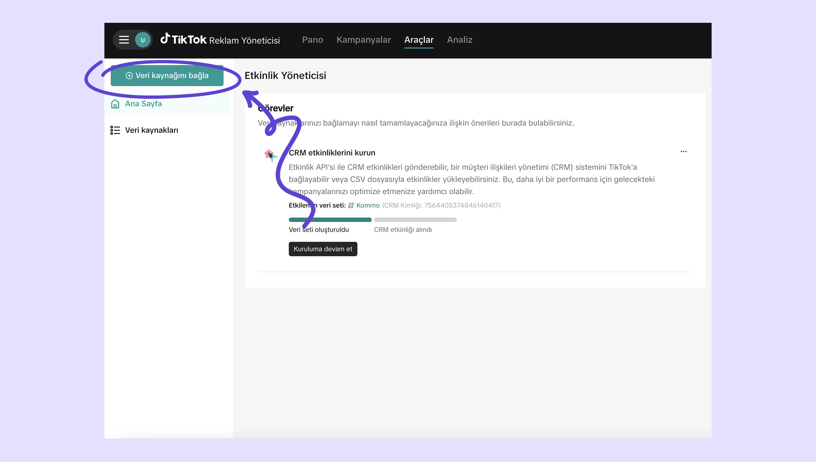 Derin Huni Optimizasyonu, yalnızca 24 Nisan 2026 tarihinden sonra TikTok Anlık Formlar'dan alınan potansiyel müşterilerle çalışacaktır. Her Kommo hesabı için yalnızca bir TikTok for Business hesabı bağlanabilir.