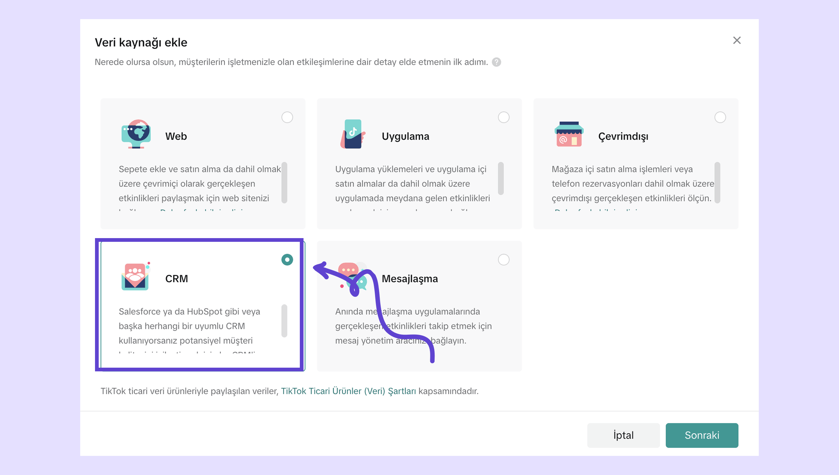 Veri kaynağı türünü CRM olarak seçin → İleri 'ye tıklayın.