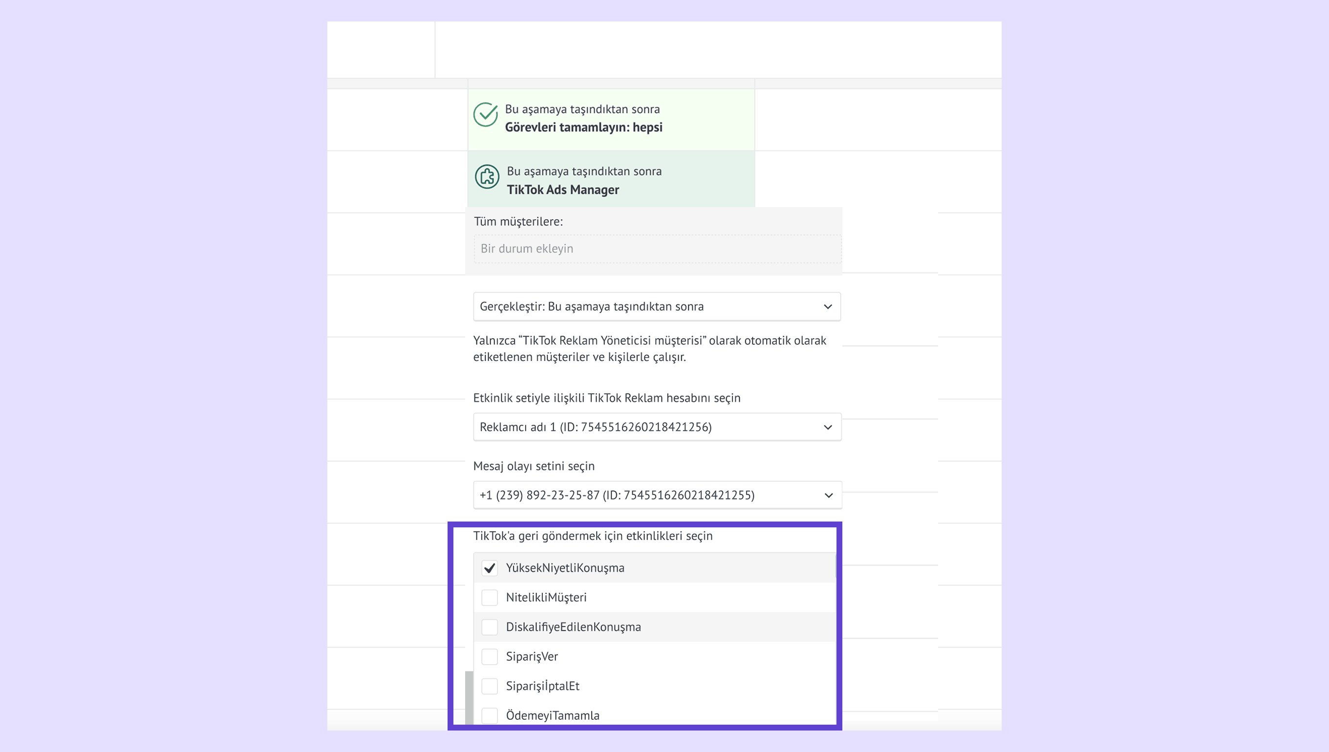 TikTok Anlık Formlar'dan elde edilen bir potansiyel müşteriyi, Derin Huni Optimizasyon tetikleyicisinin yapılandırıldığı satış hunisi aşamasına taşıyın. -