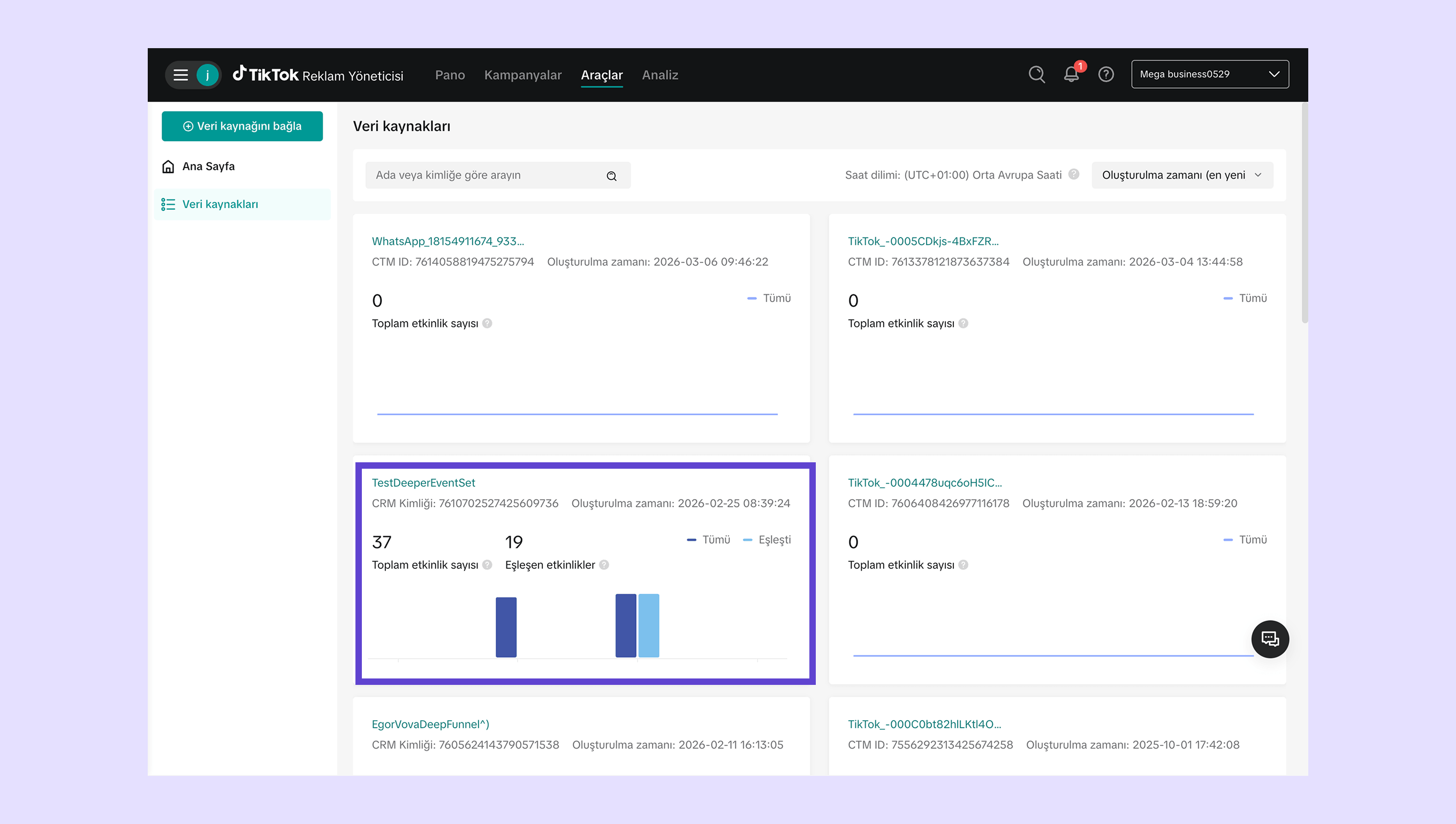 Şuraya gidin TikTok Reklamları → Araçlar → Etkinlik Yöneticisi → Veri kaynakları . Bu potansiyel müşteriye dayalı olarak gönderilen etkinlikler bu sayfada görünecektir.