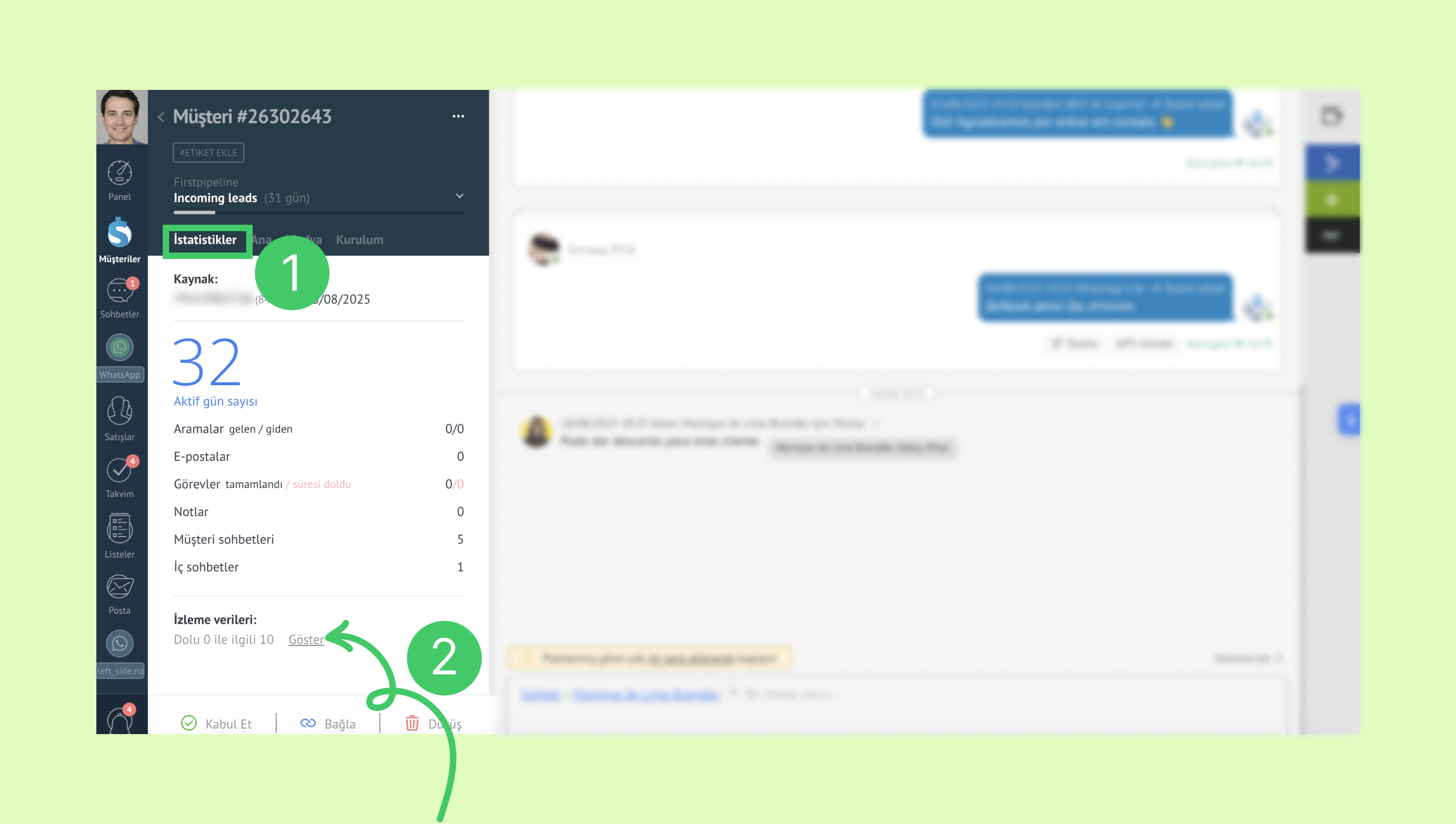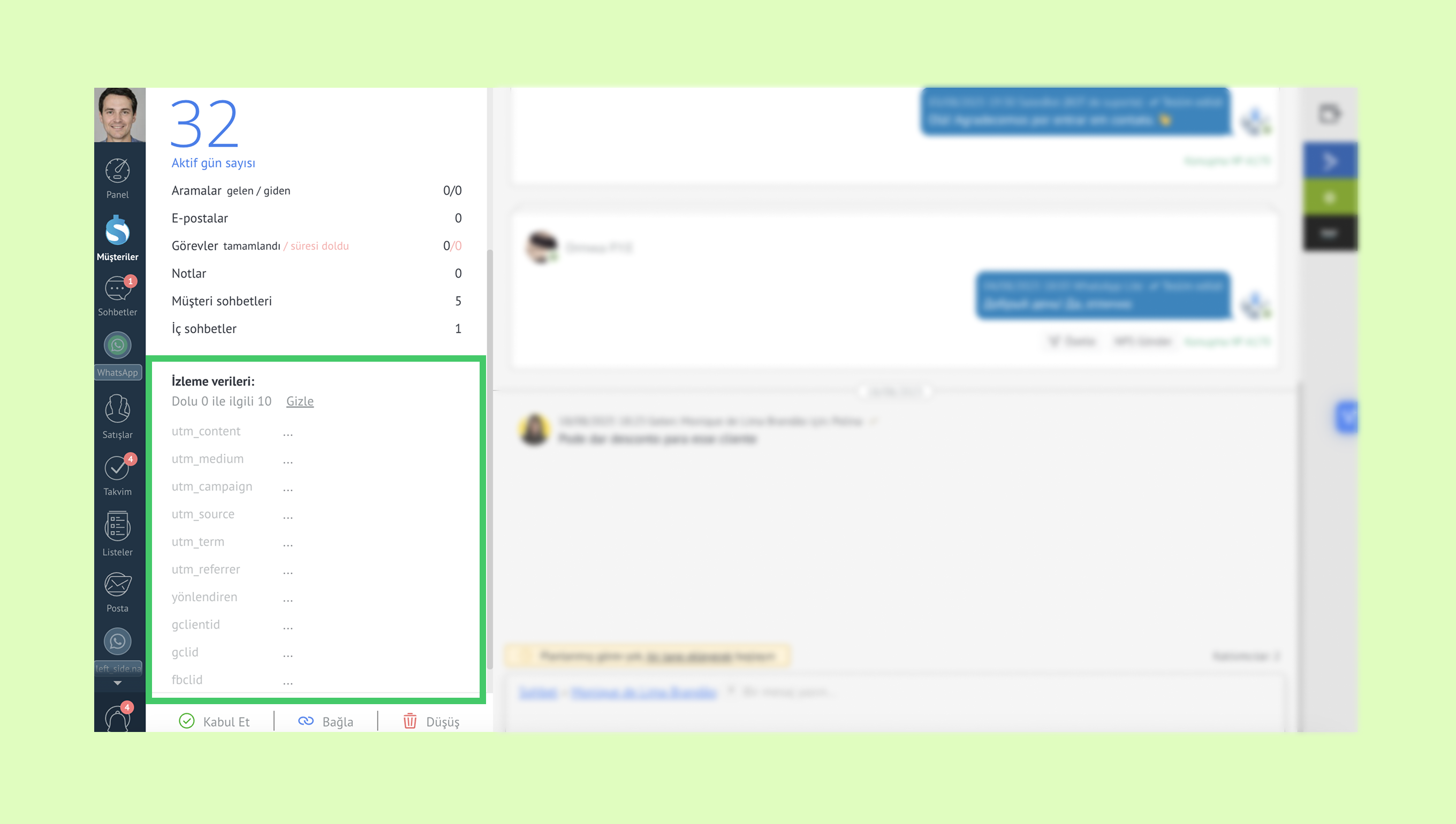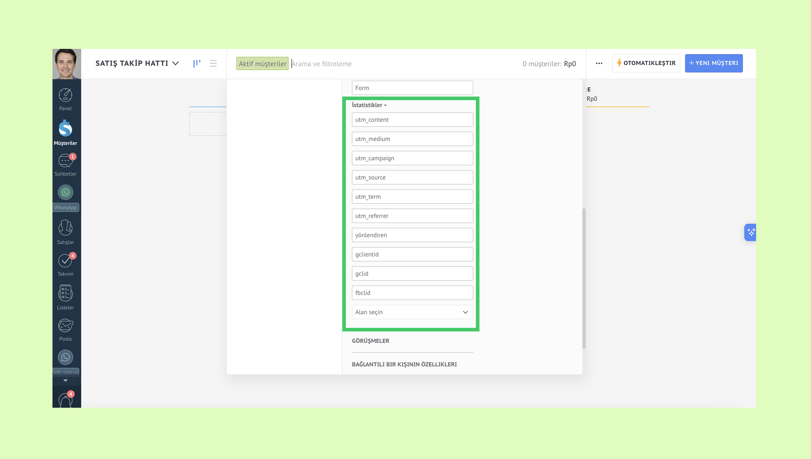 Performansı değerlendirmek için, Müşteriler → Arama ve filtreleme bölümüne gidin ve UTM alanlarına göre filtreleme yapın.