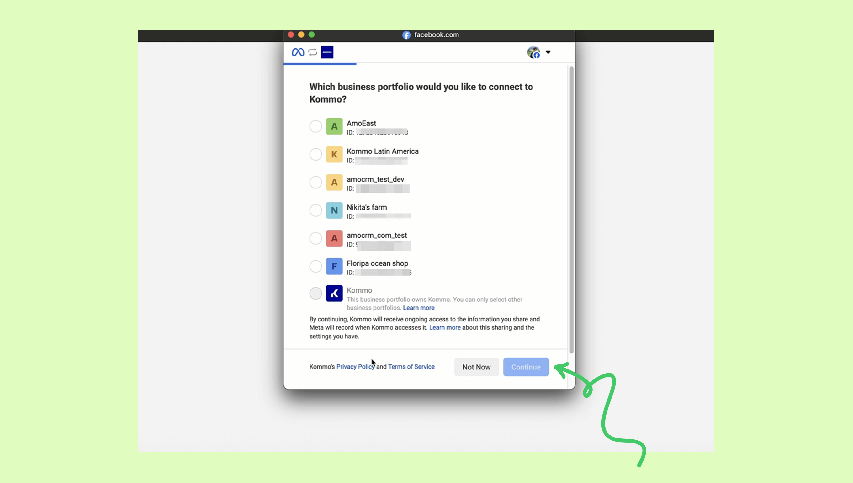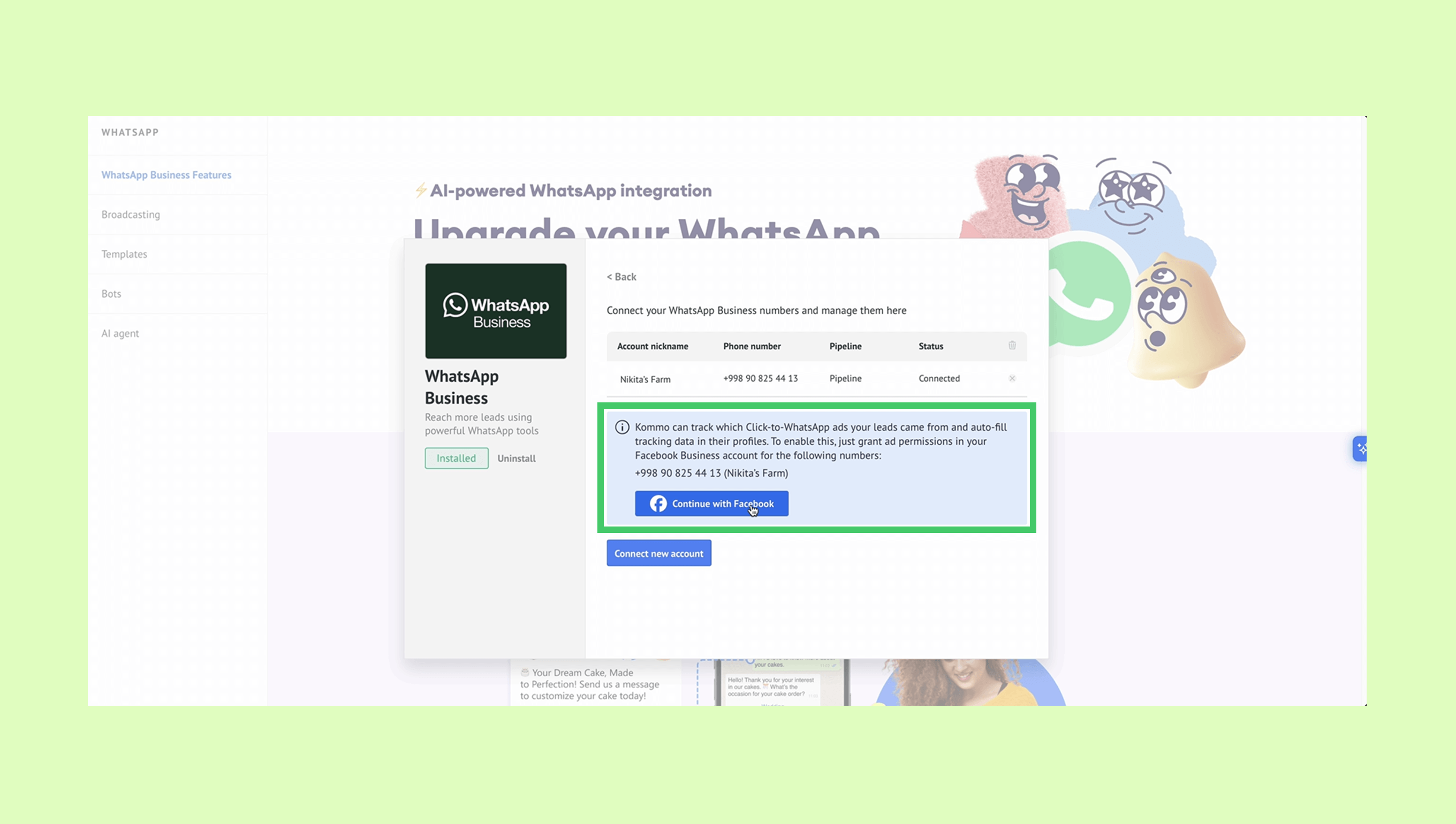 Kommo’da, reklam meta verilerini okumak için izin verin. WhatsApp Business entegrasyonu → Hesaplar bölümüne gidin. Üst bantta, Facebook ile Devam Et tuşuna tıklayın ve CAPTCHA’yı tamamlayın.