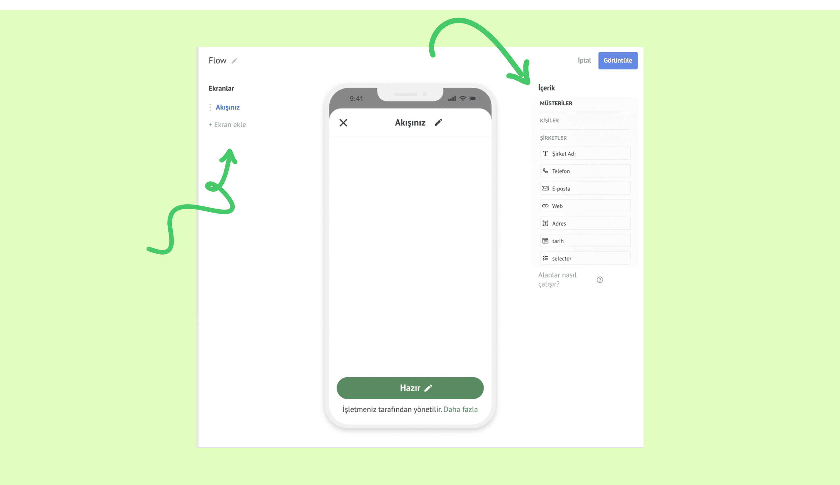 Her Flow en fazla 8 ekrana sahip olabilir ve her ekran talimatlar veya resimler gibi alanlar veya içerik blokları içerebilir. Tüm alanlar özelleştirilebilir ve CRM özelliklerine bağlanabilir.