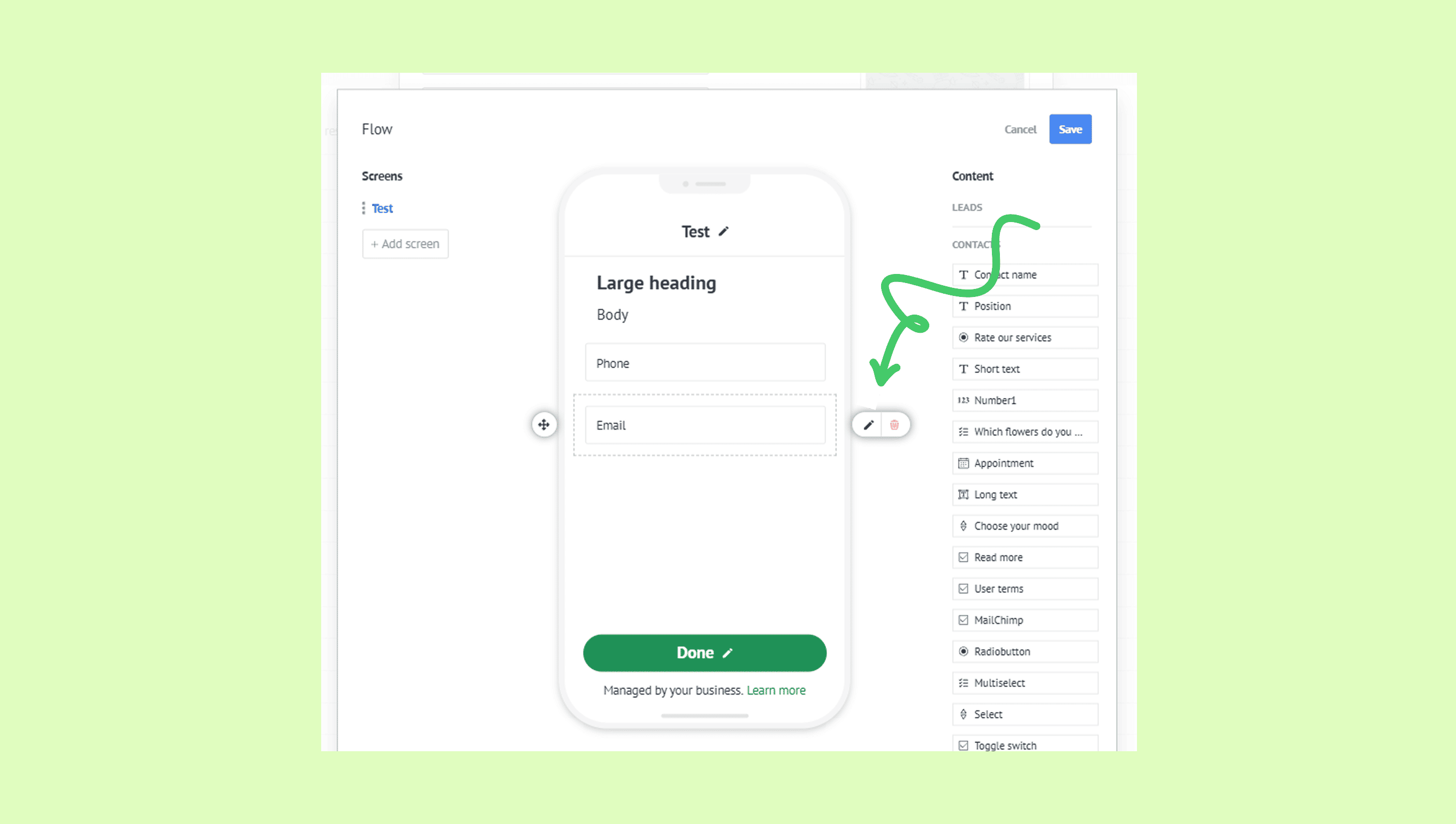 - Ekran başlıklarını, talimatları ve düğmeleri özelleştirin. Her ekranın en az bir alan veya içerik bloğu olması gerekir.
