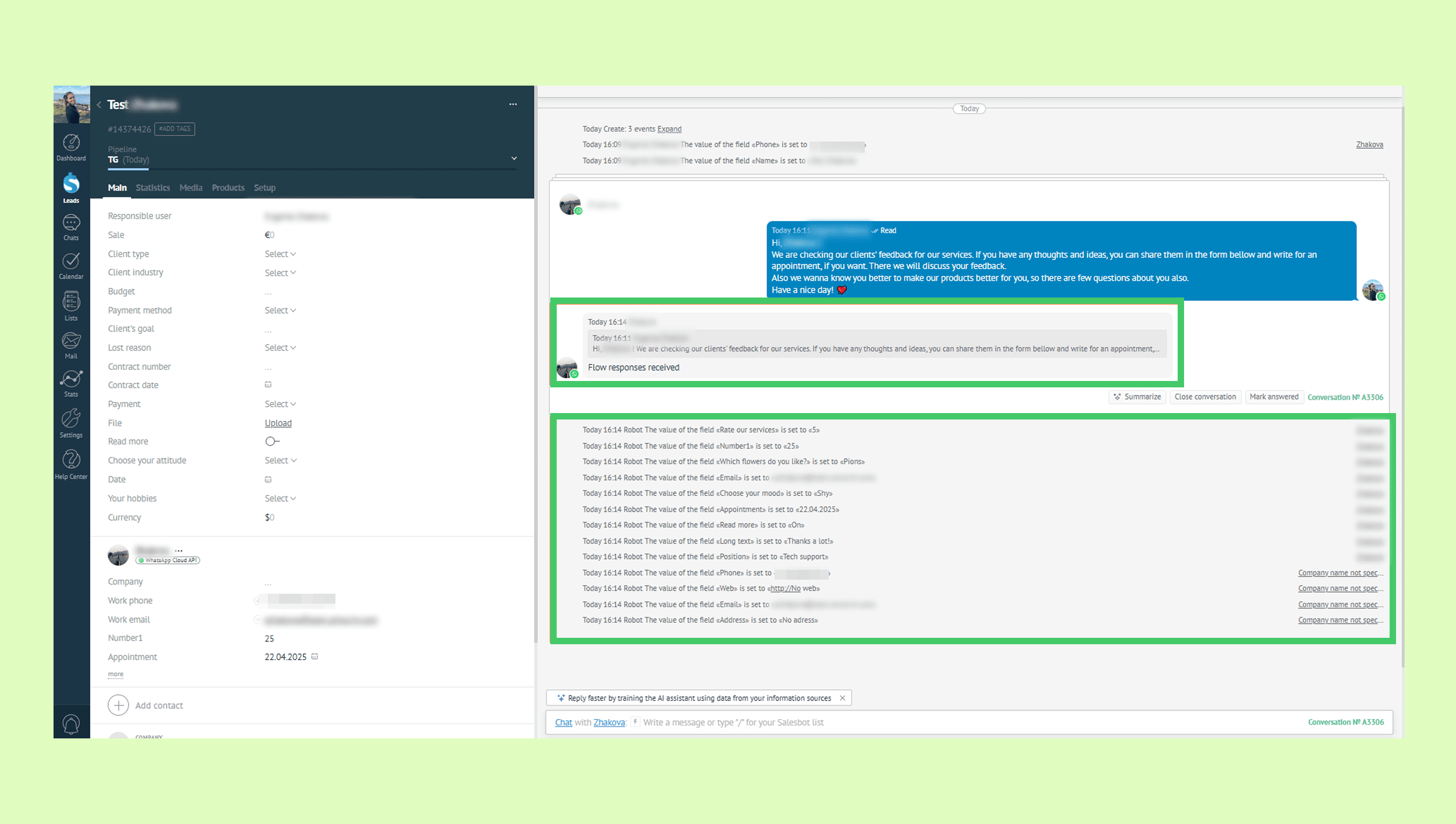 Flow şablonlarından gelen tüm müşteri yanıtları CRM'nize otomatik olarak kaydedilir.