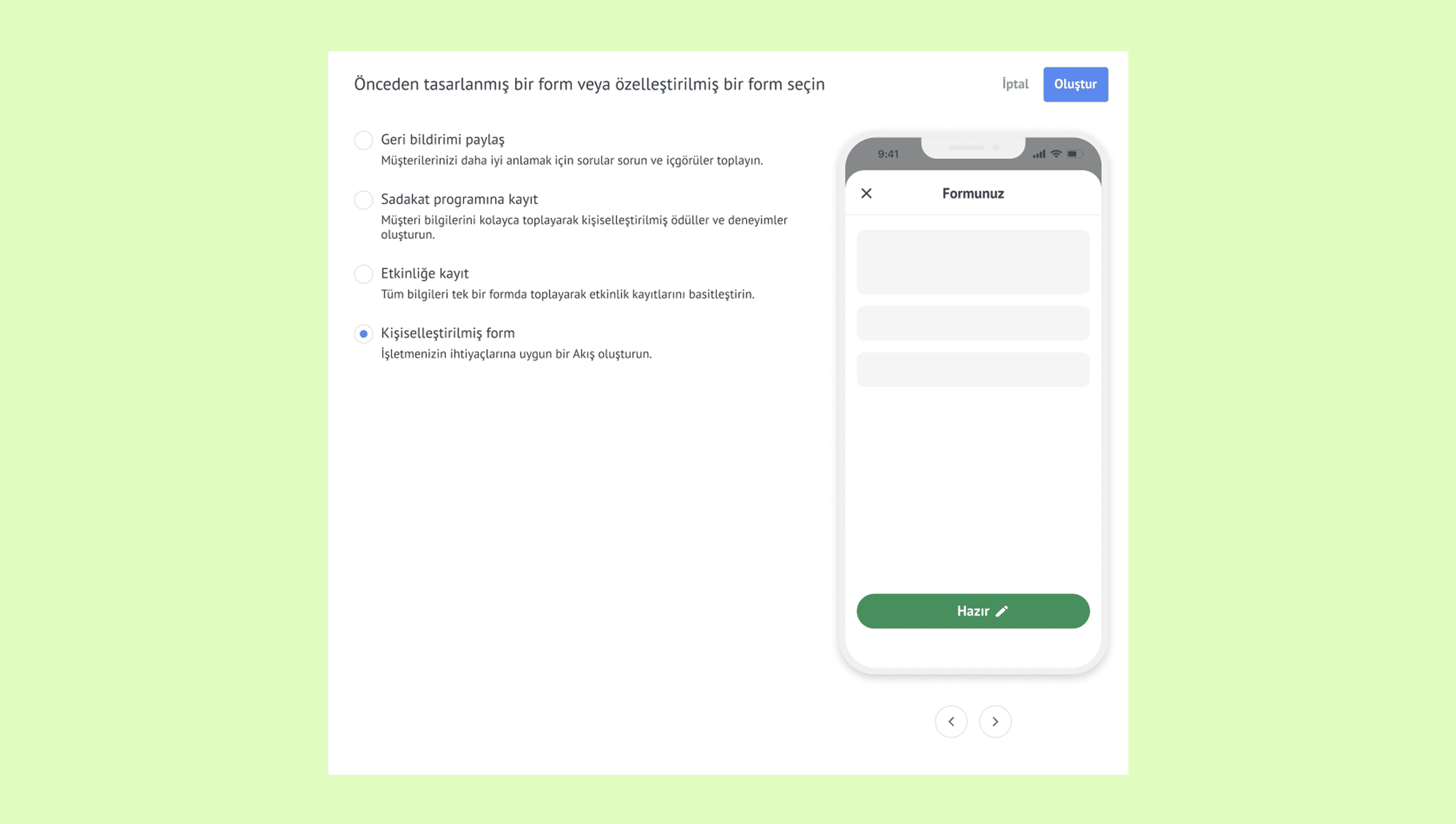 Önceden ayarlanmış bir şablon seçin (Geri Bildirim, Etkinlik kaydı veya Sadakat programı kaydı gibi) veya sıfırdan kendi formunuzu oluşturun.