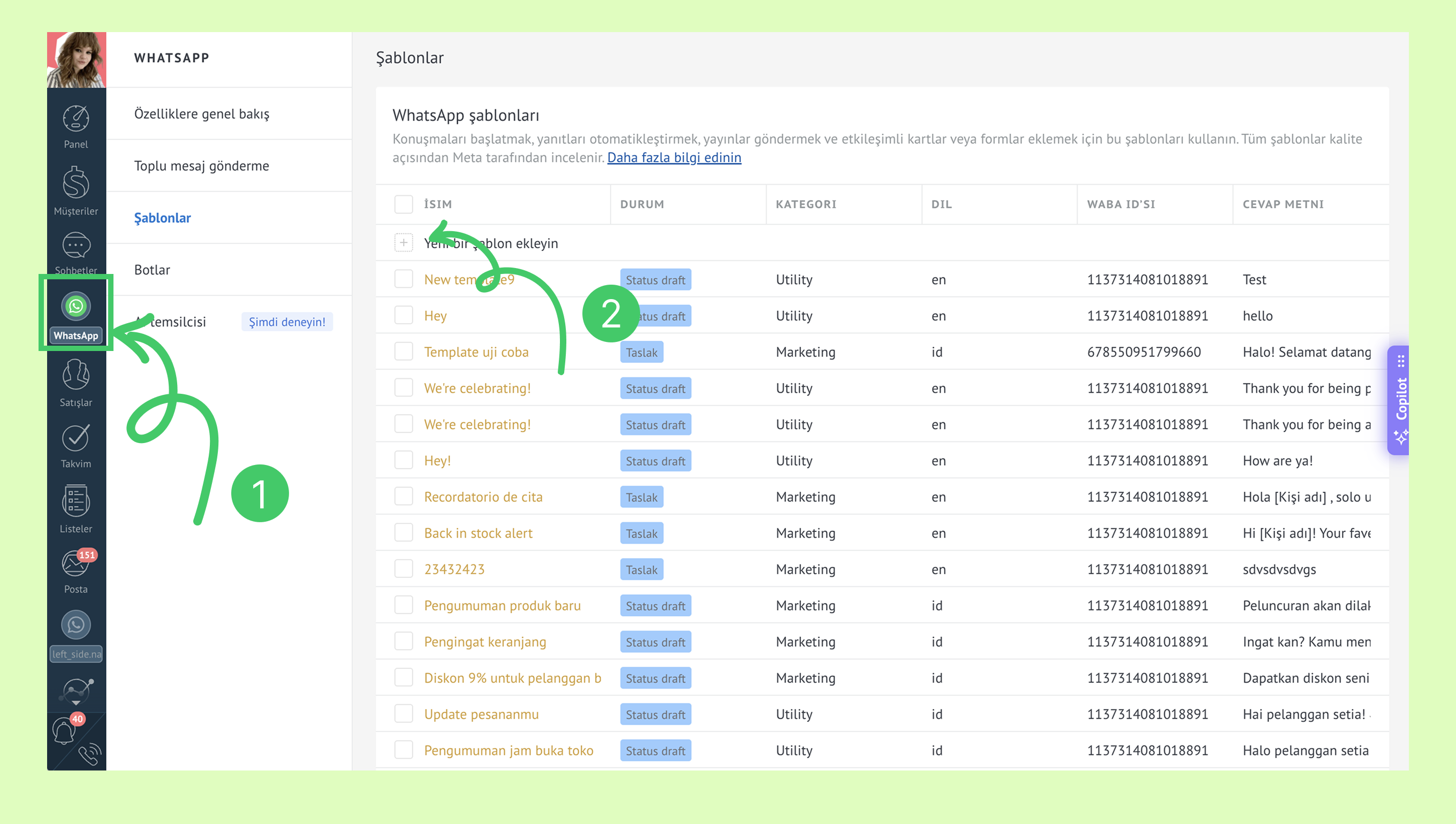 WhatsApp → Şablonlar → WhatsApp şablonları'na gidin ve Yeni şablon ekle'ye tıklayın.