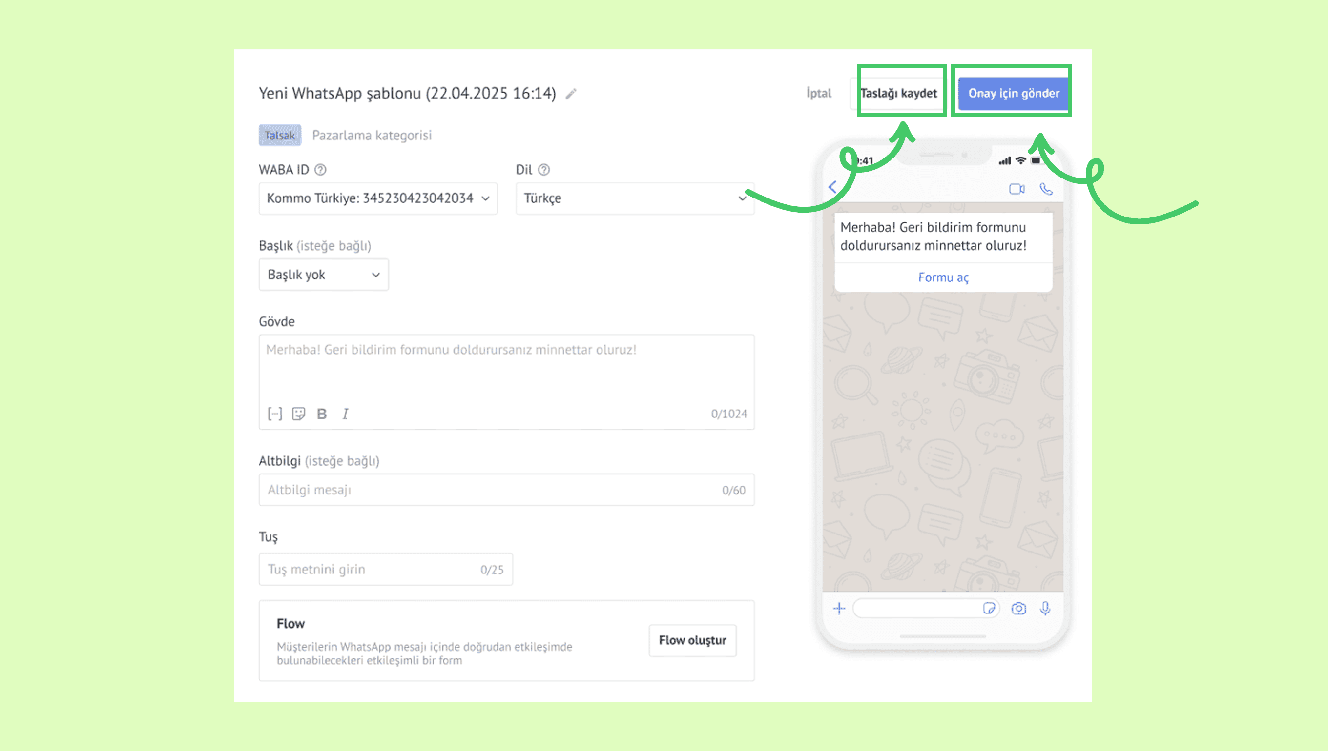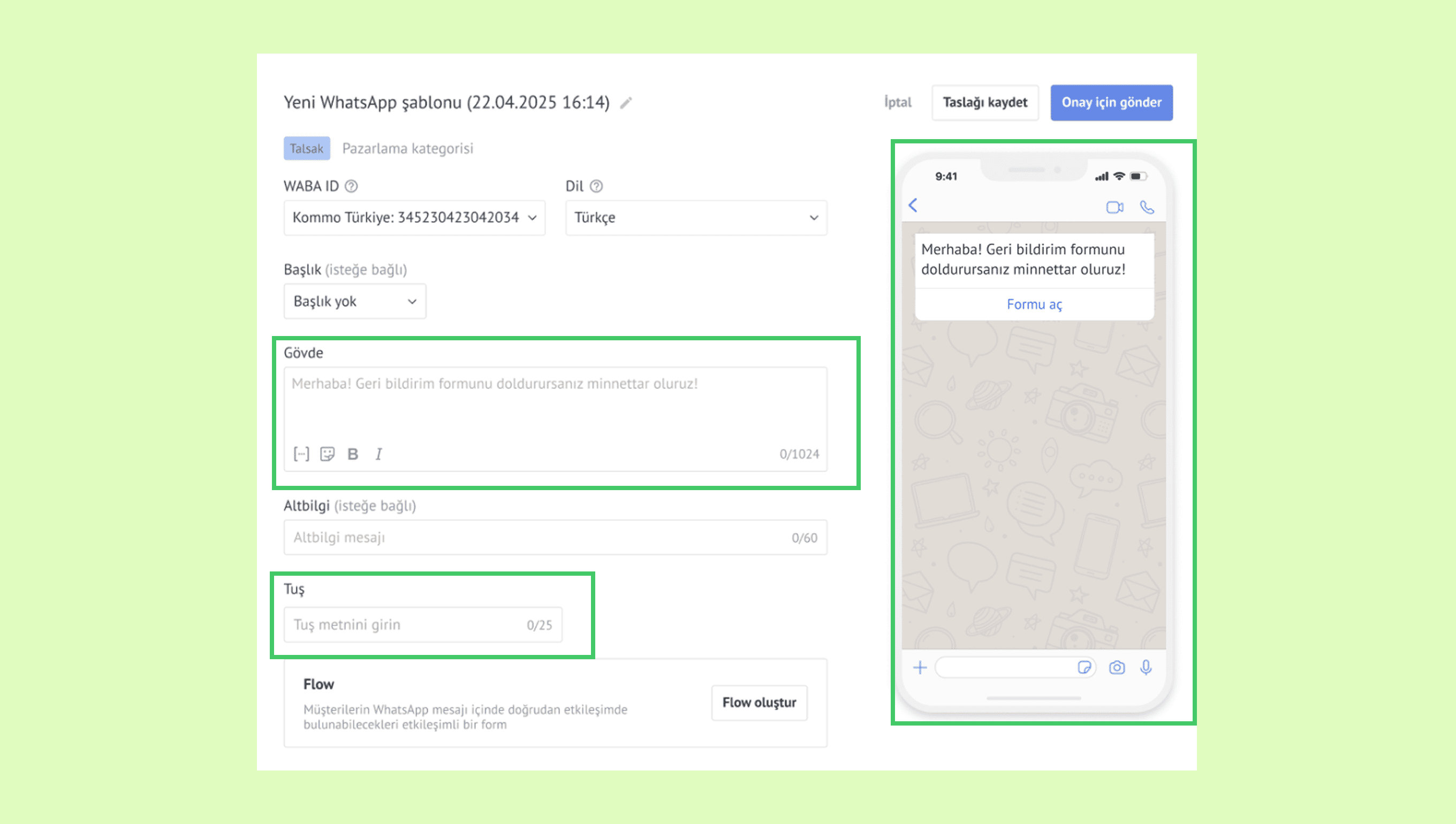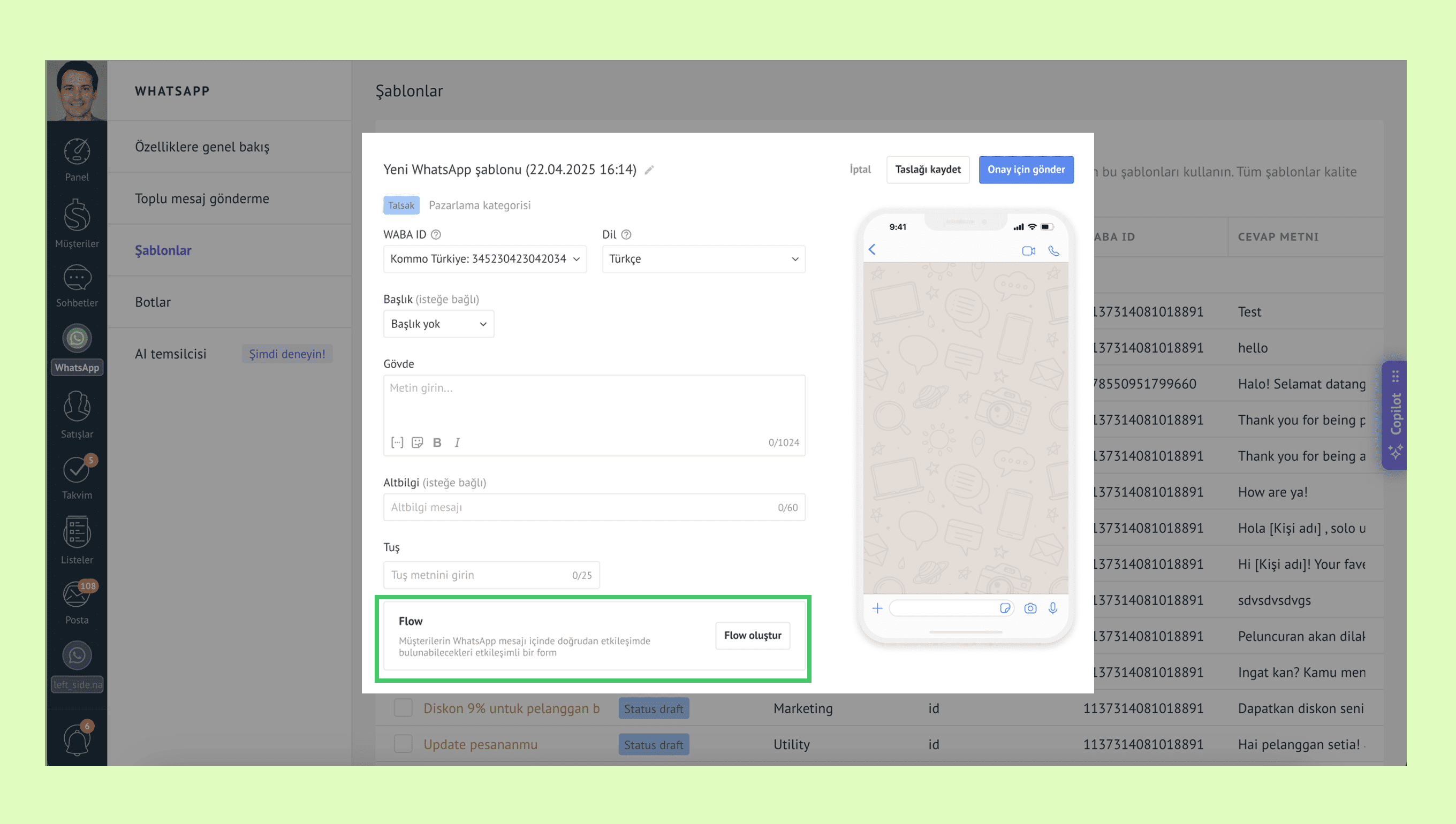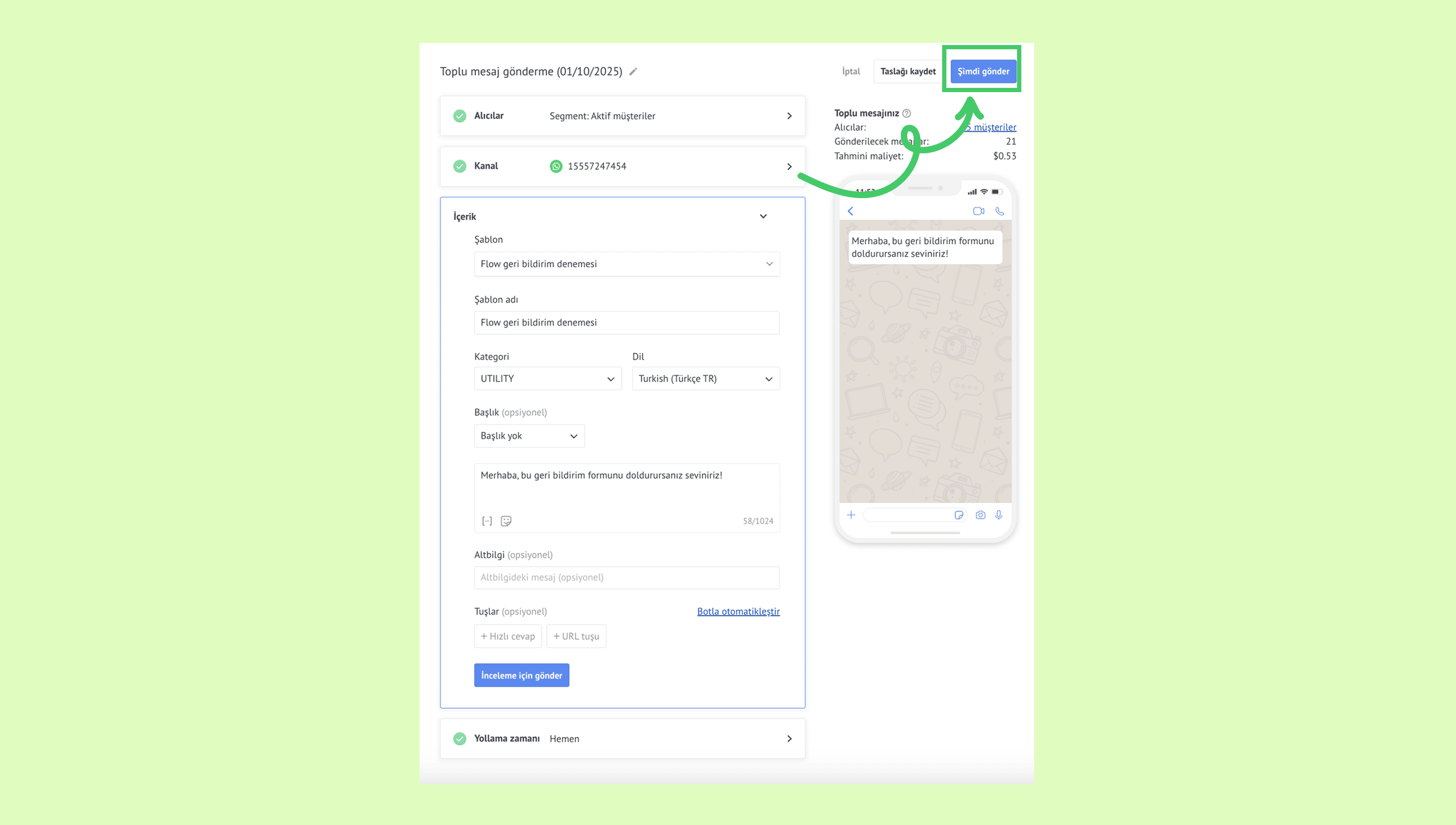Not: Flowu önceden oluşturup onaylamanız gerekir. Toplu mesaj göndermede doğrudan şablon oluşturmak mümkün değildir.