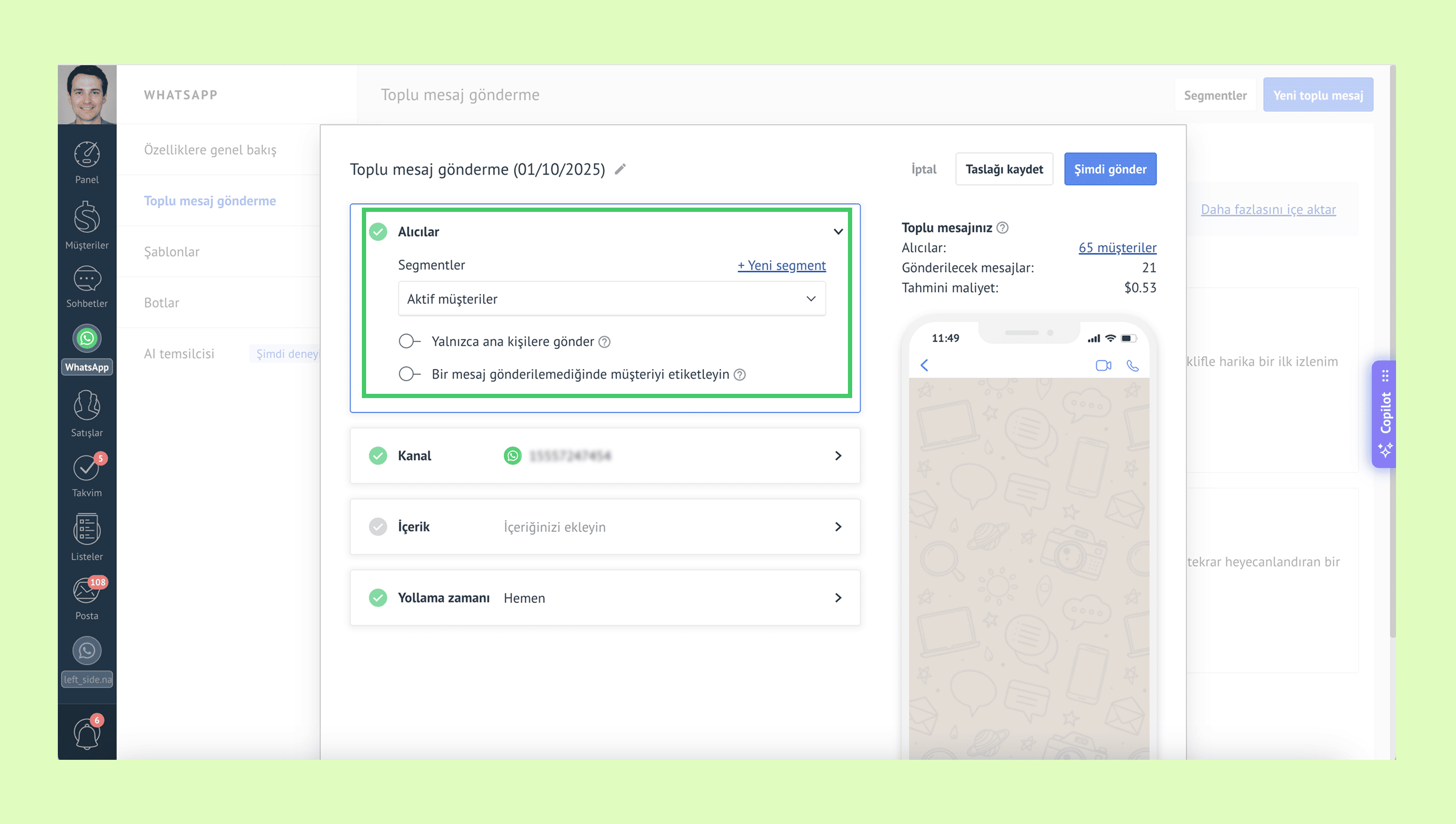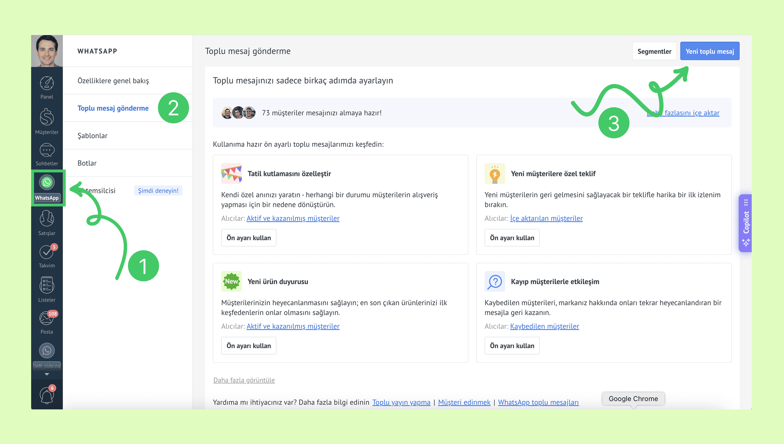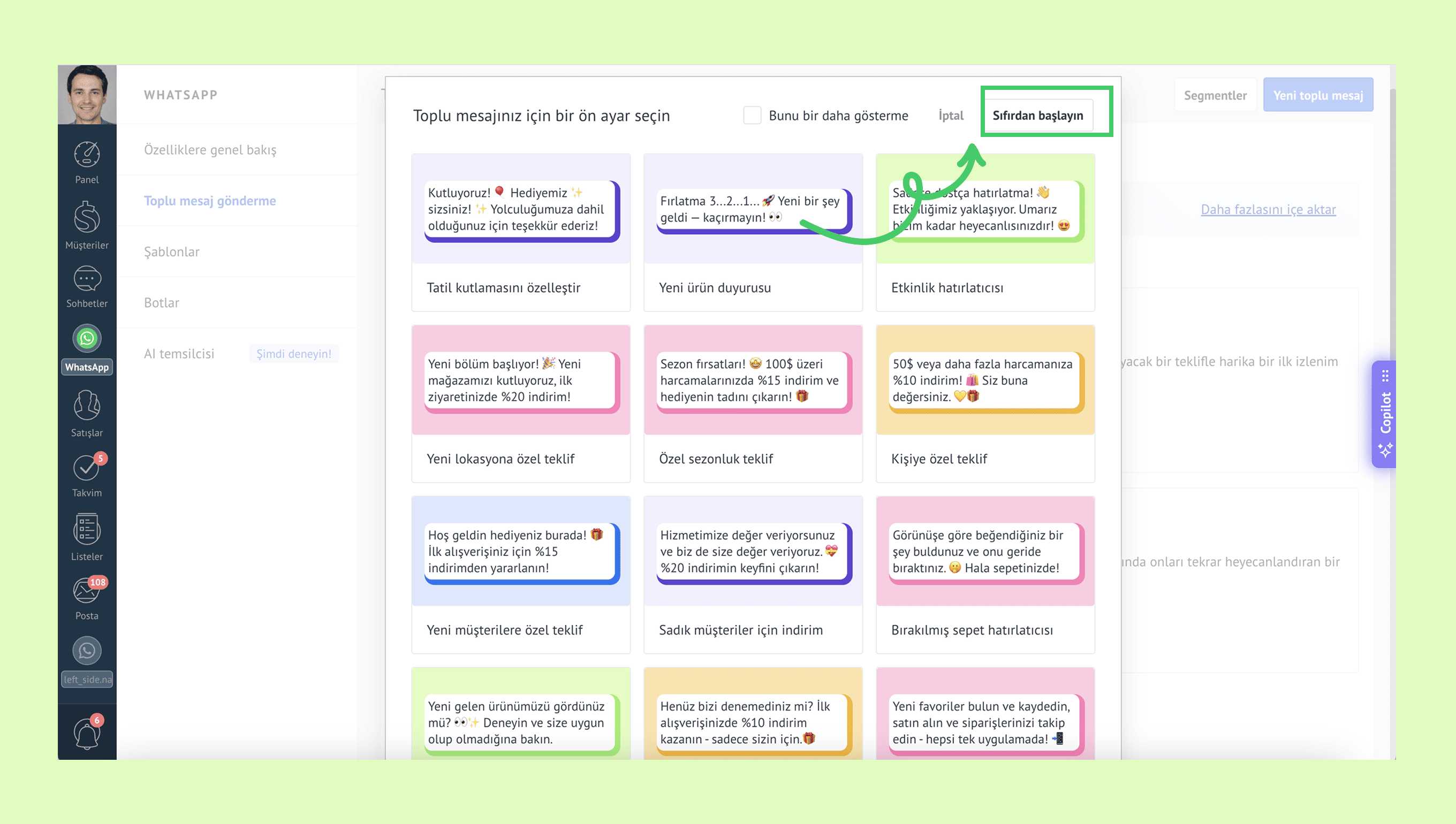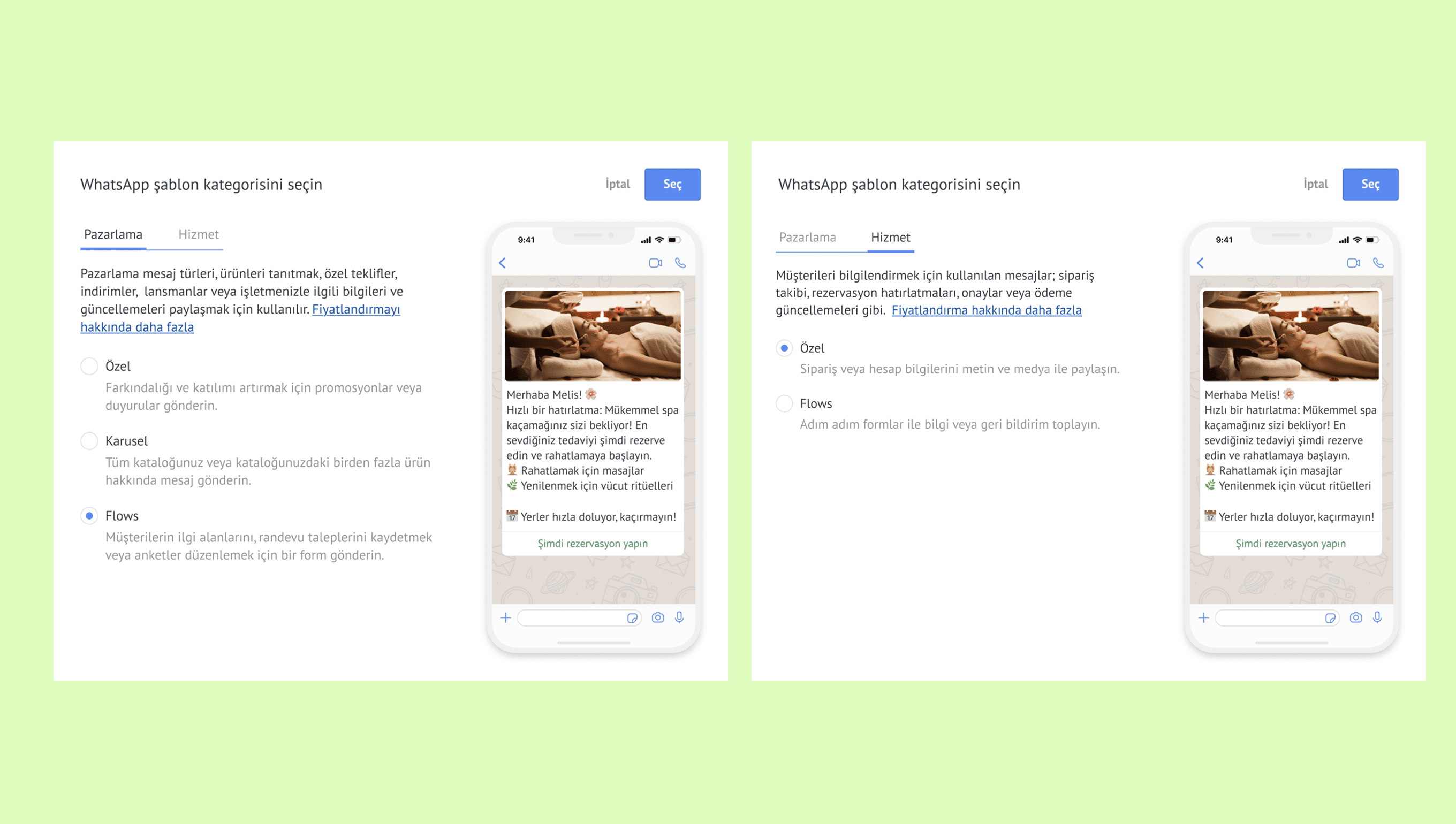 Not: Flowu önceden oluşturup onaylamanız gerekir. Toplu mesaj göndermede doğrudan şablon oluşturmak mümkün değildir.
