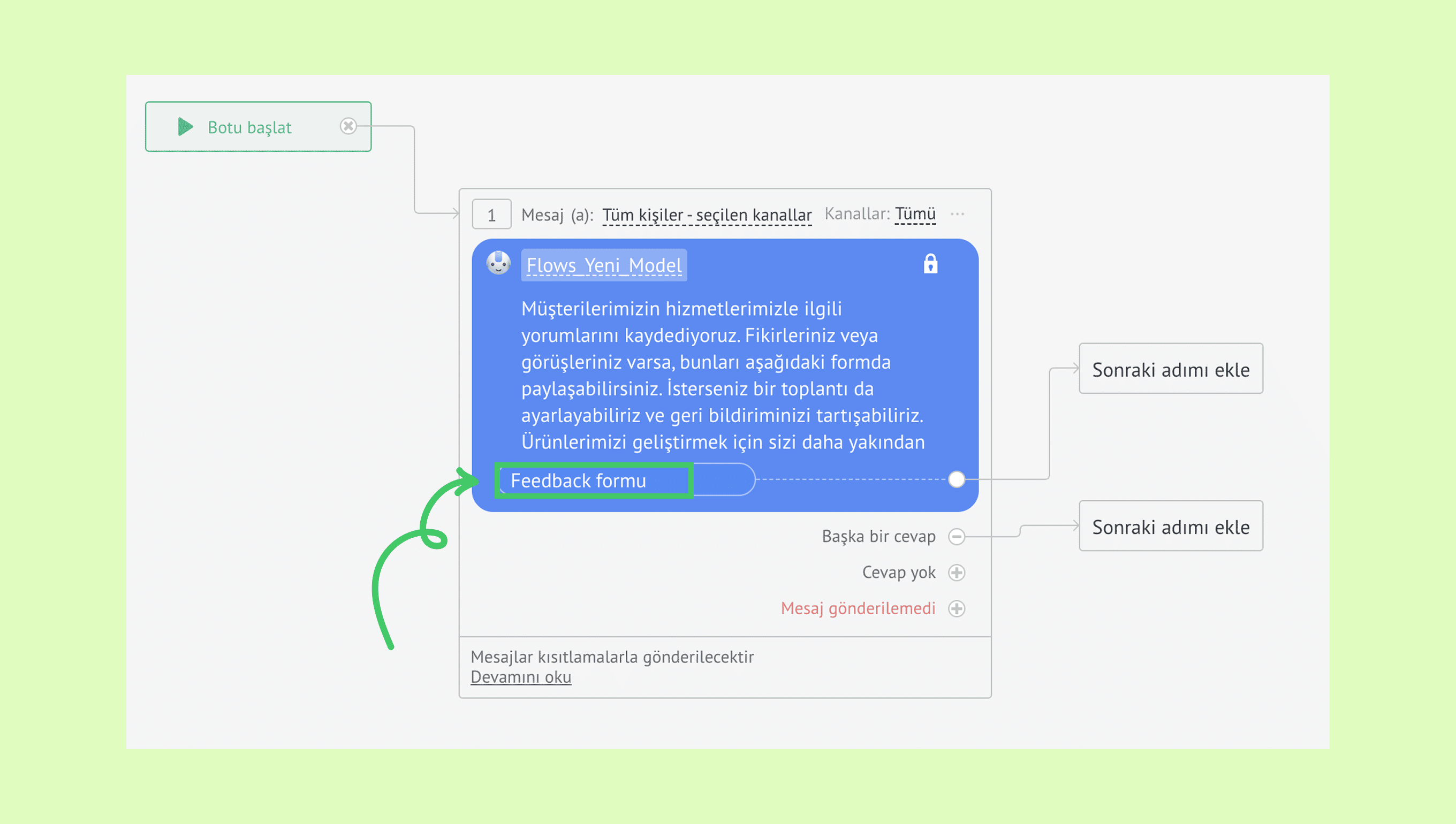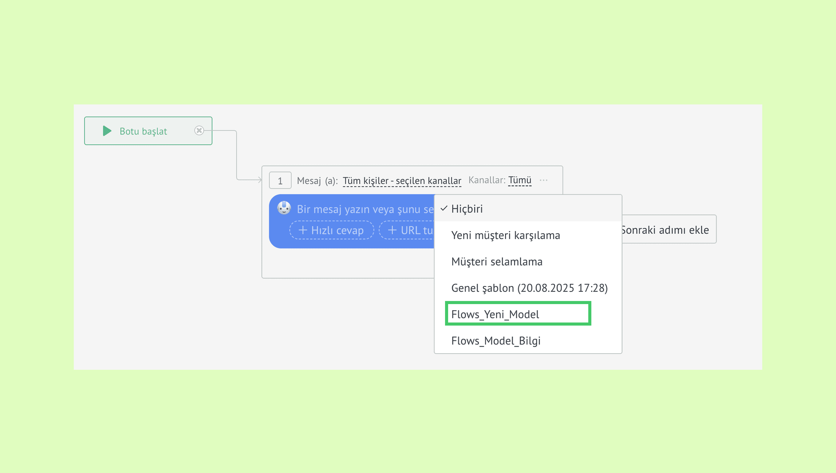 - Bot bu adıma ulaştığında akış otomatik olarak gönderilecektir.