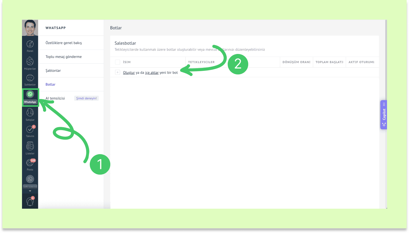 WhatsApp'ta bot oluştur → Botlar → Yeni bot oluştur.