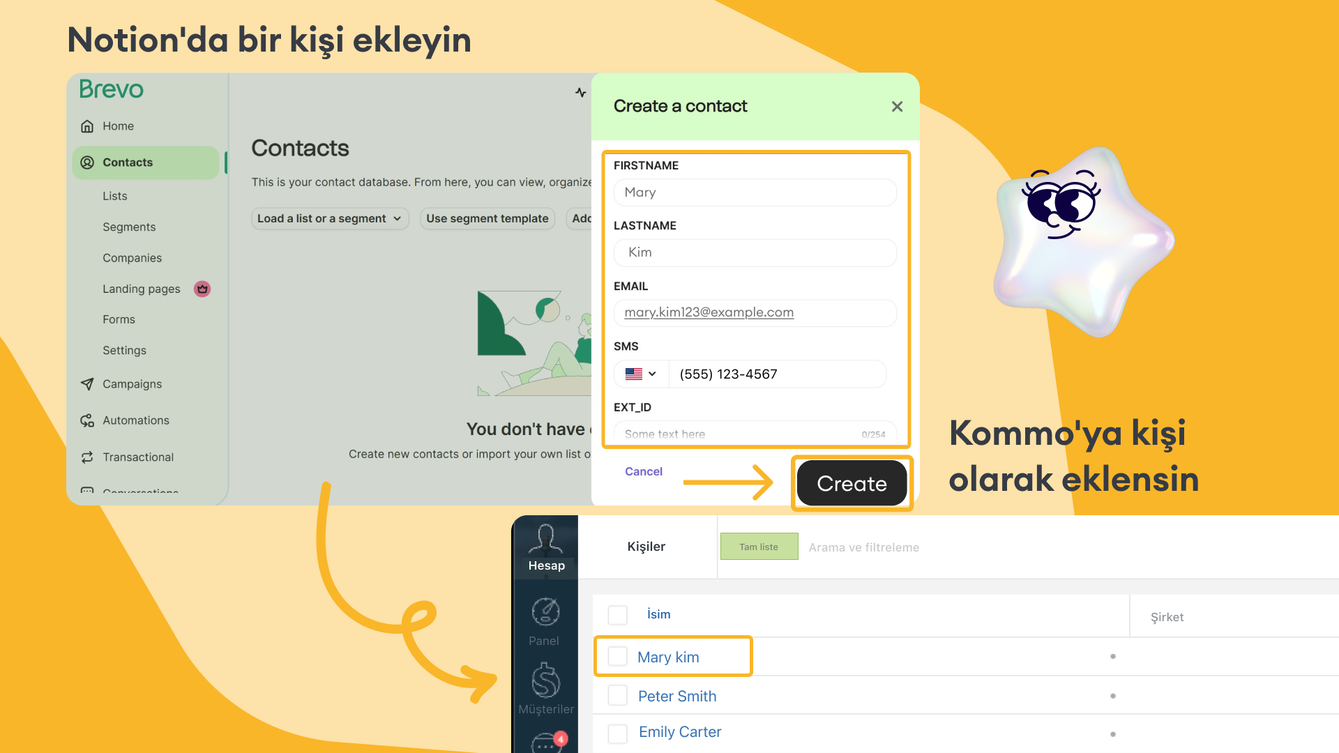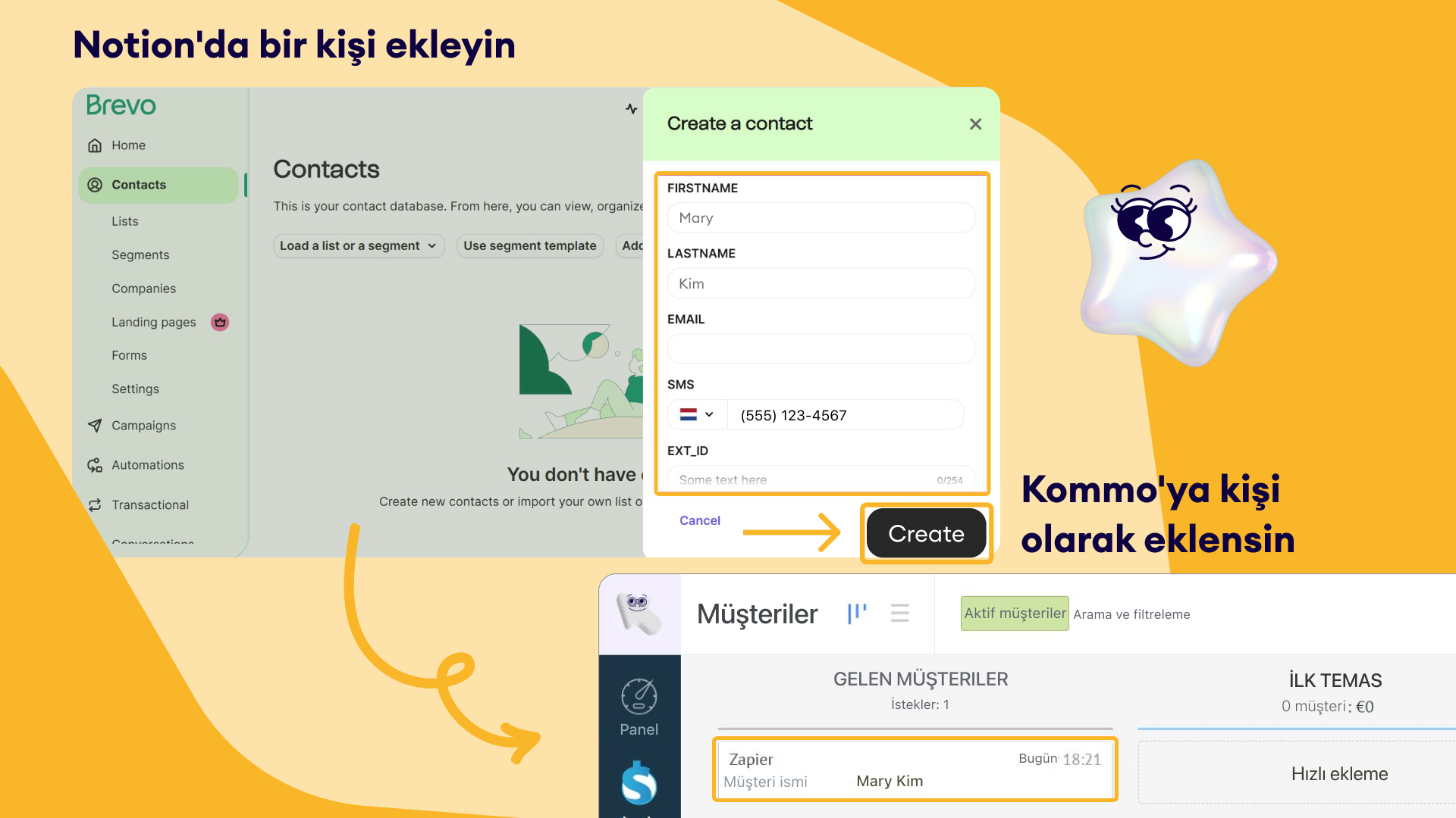 Otomatik müşteri senkronizasyonu: Sürekli iletişim için yeni Kommo müşterilerini Brevo kişi listelerinize anında ekleyin.