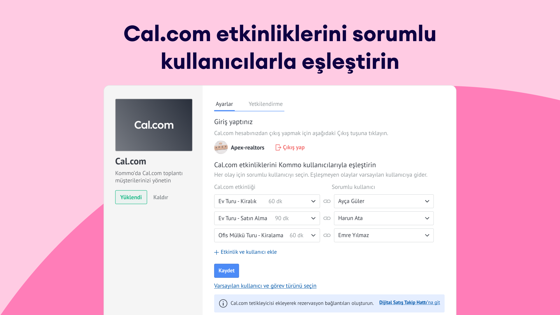 Etkinlik-kullanıcı eşleştirme: Kommo kullanıcılarına belirli Cal.com etkinliklerini atayın, böylece her randevunun sorumlu bir sahibi olsun.