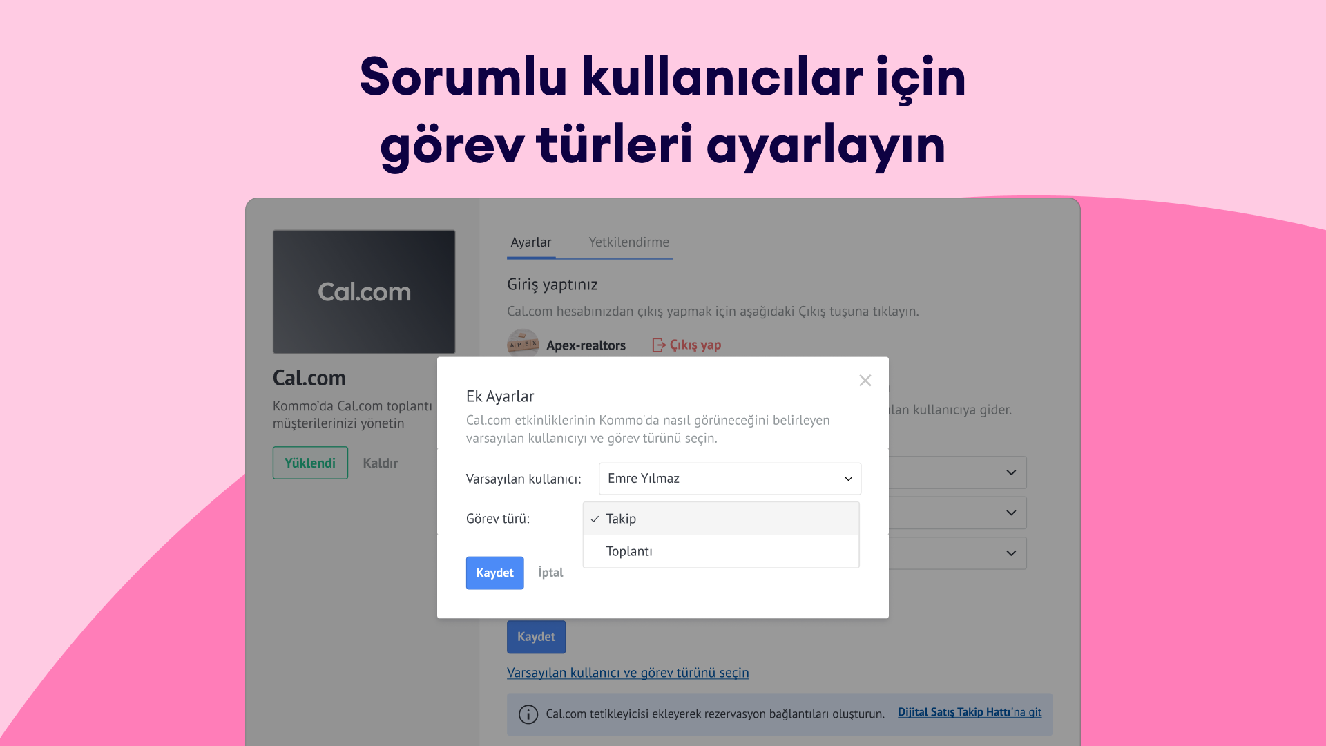 - Eşlemeyi yapılandırın: Cal.com etkinliklerini Kommo kullanıcılarına atayın ve görev türlerini (ör. takip veya toplantı) belirtin.