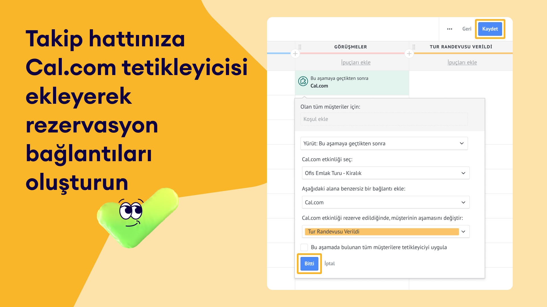Tetikleyici tabanlı iş akışları: Müşteriler belirli bir satış takip hattı aşamasına geldiklerinde, onlar için otomatik olarak kişiselleştirilmiş rezervasyon bağlantıları oluşturun.