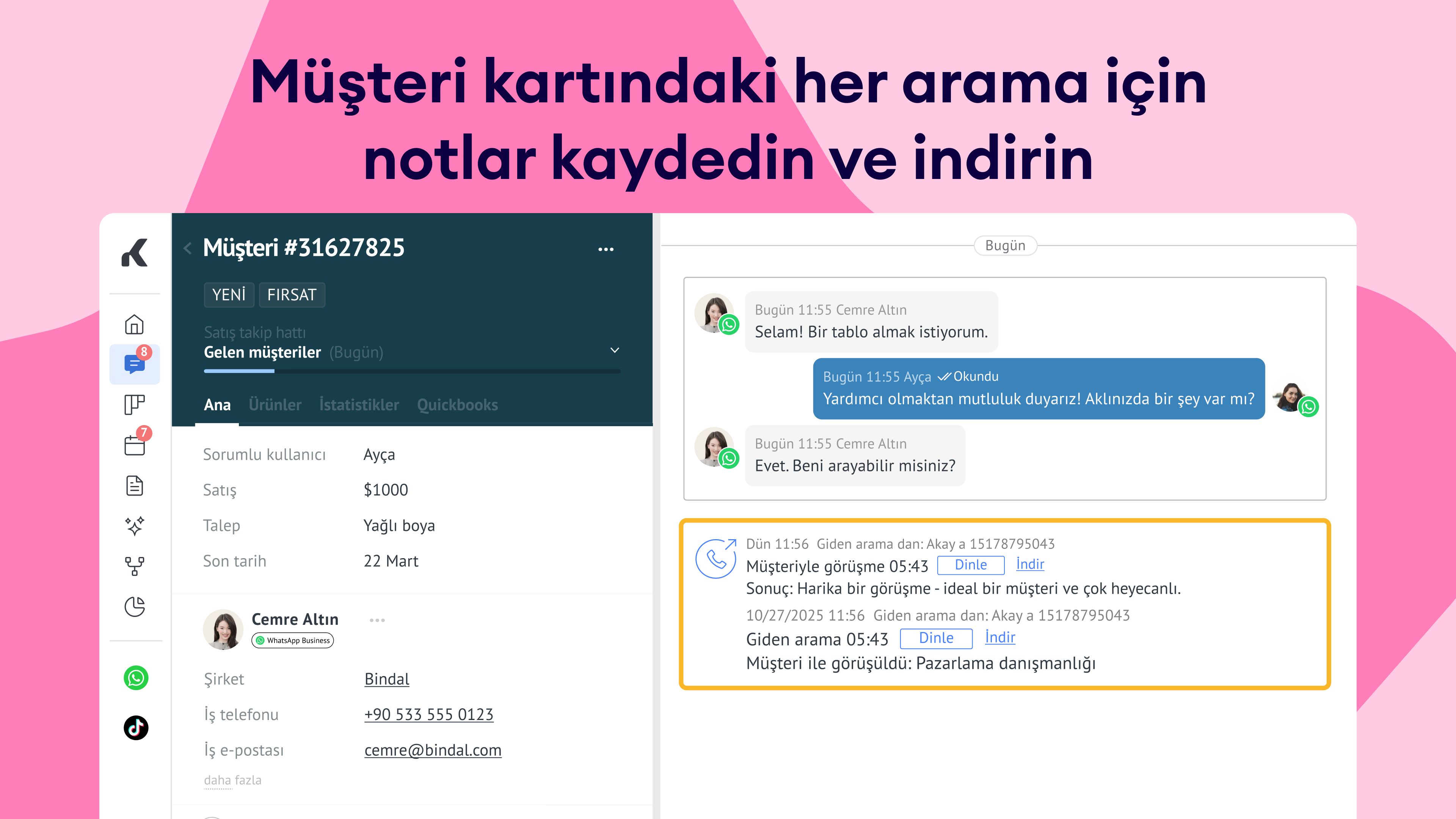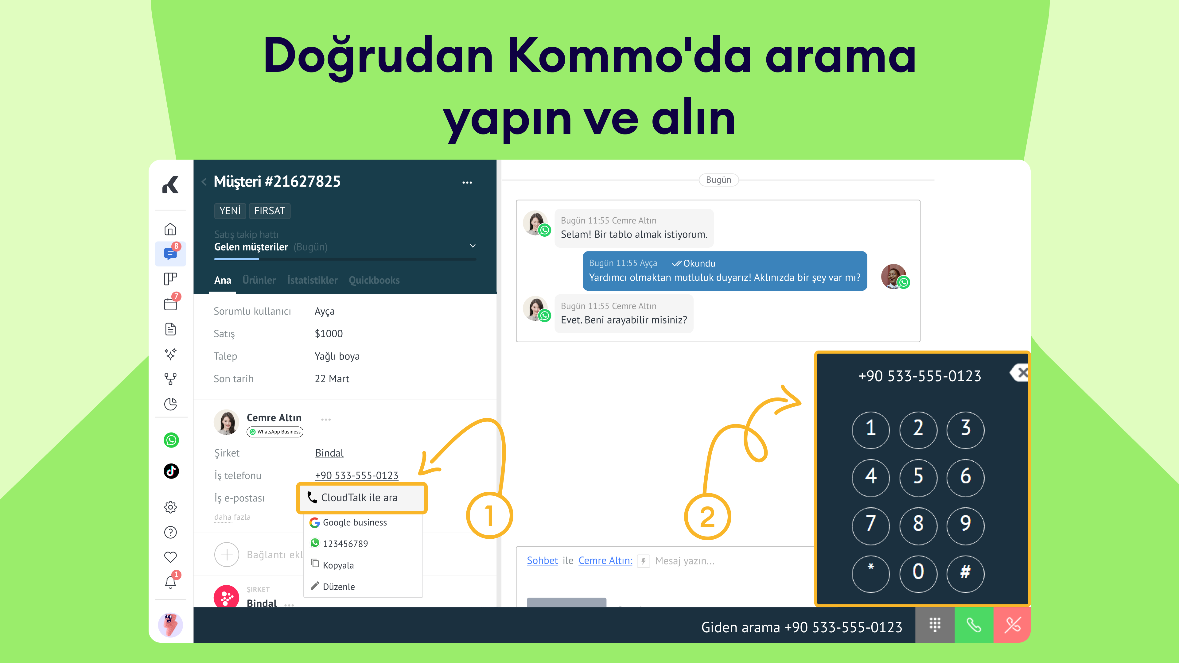 Tıkla ve ara işlevi: Tek bir tıklama ile doğrudan müşteri kartlarından arama başlatın, manuel olarak numara çevirme ihtiyacını ortadan kaldırın.