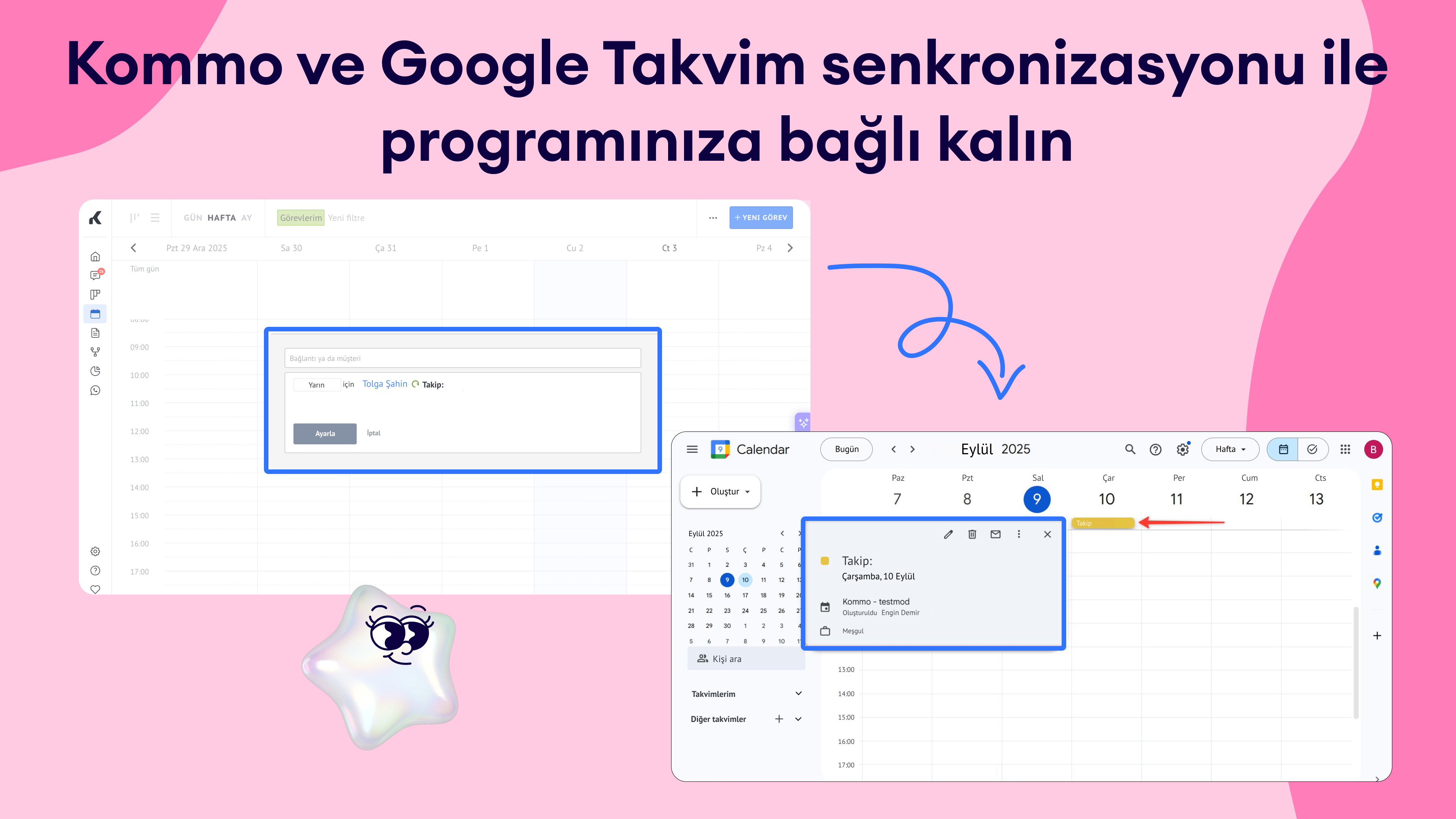 Toplantıları müşteri kartlarına bağlayın: Google Takvim etkinliğine bir müşteri kartı kimliği ekleyin, Kommo ilgili görevi otomatik olarak oluşturur.