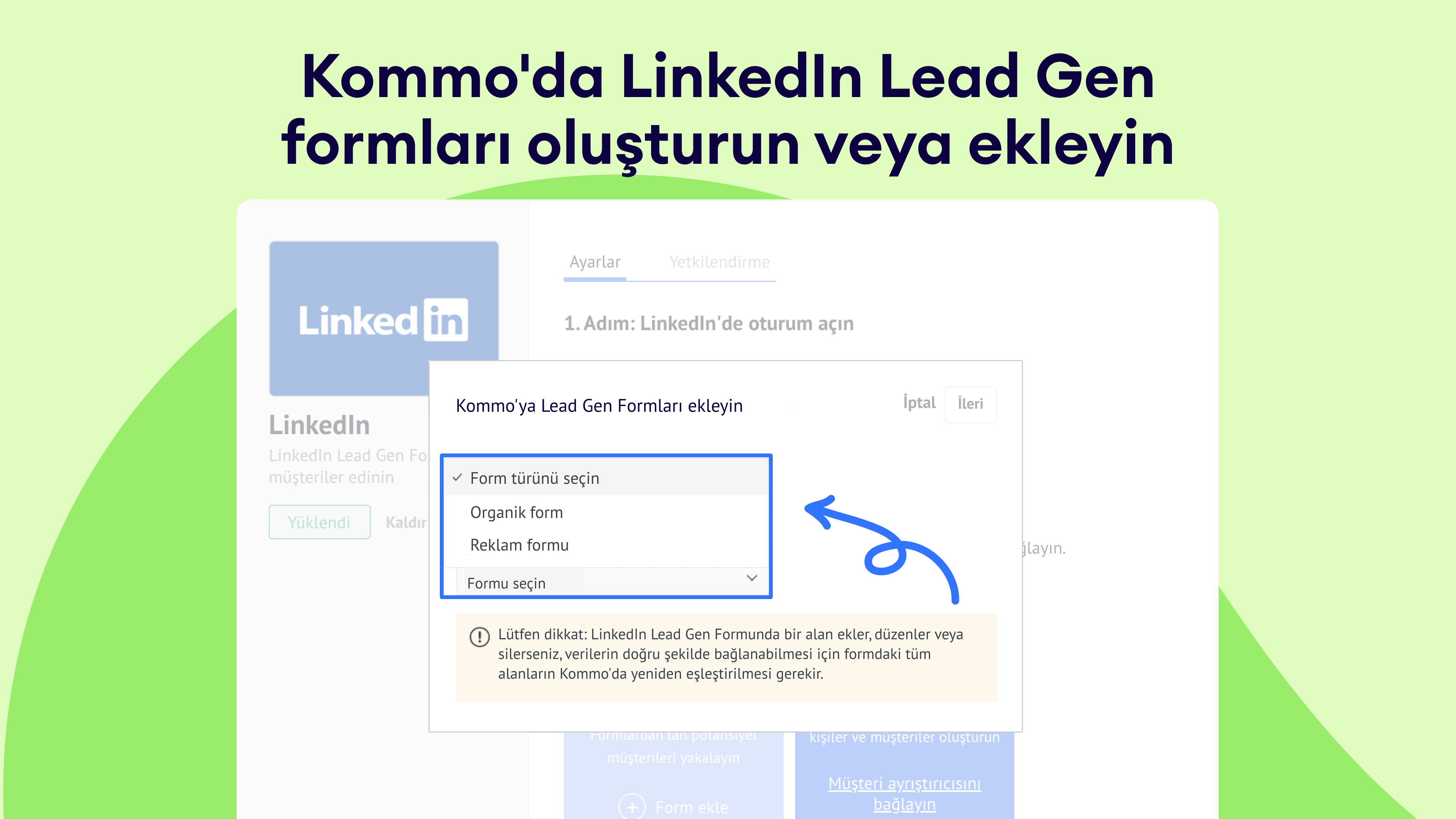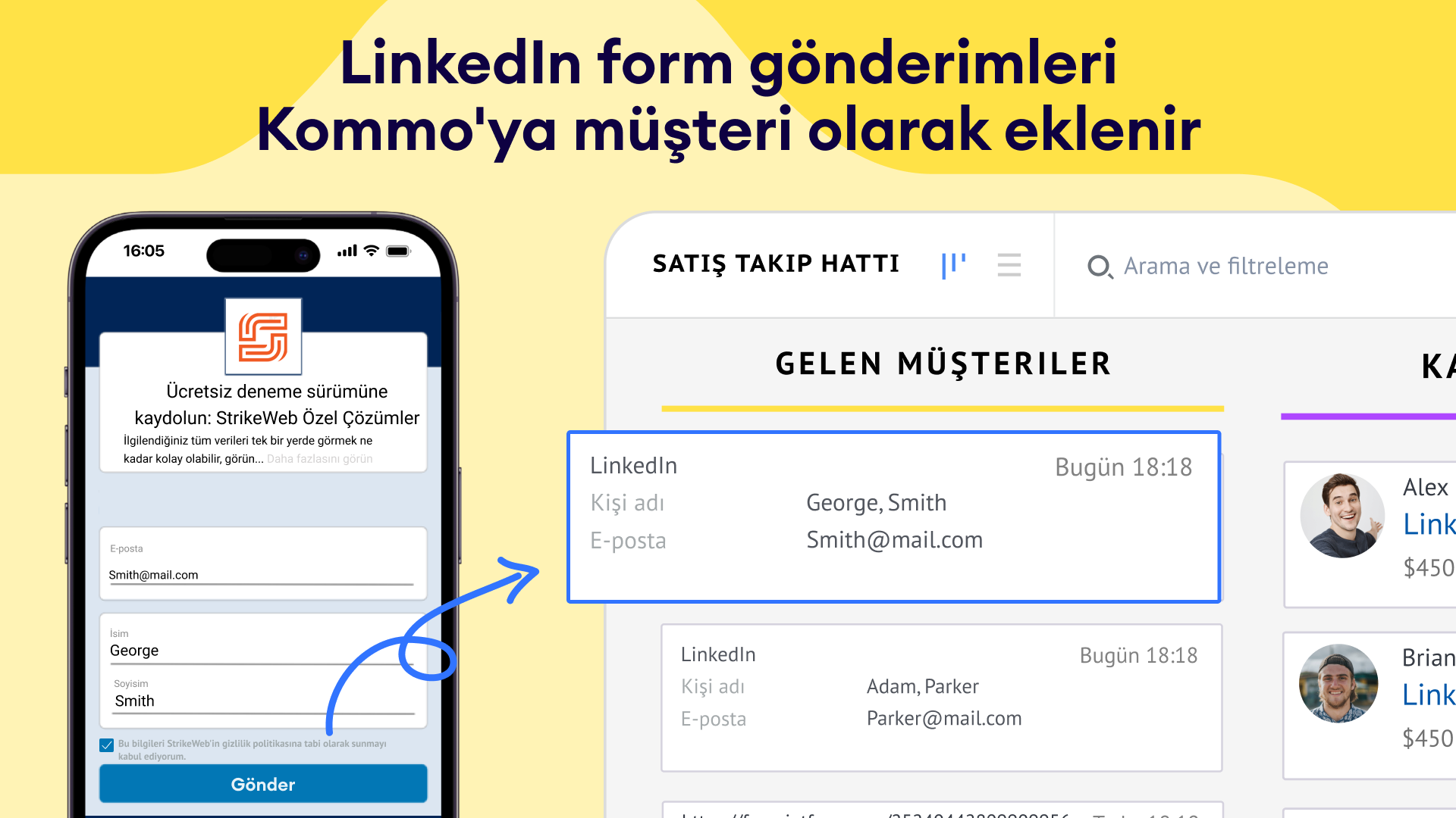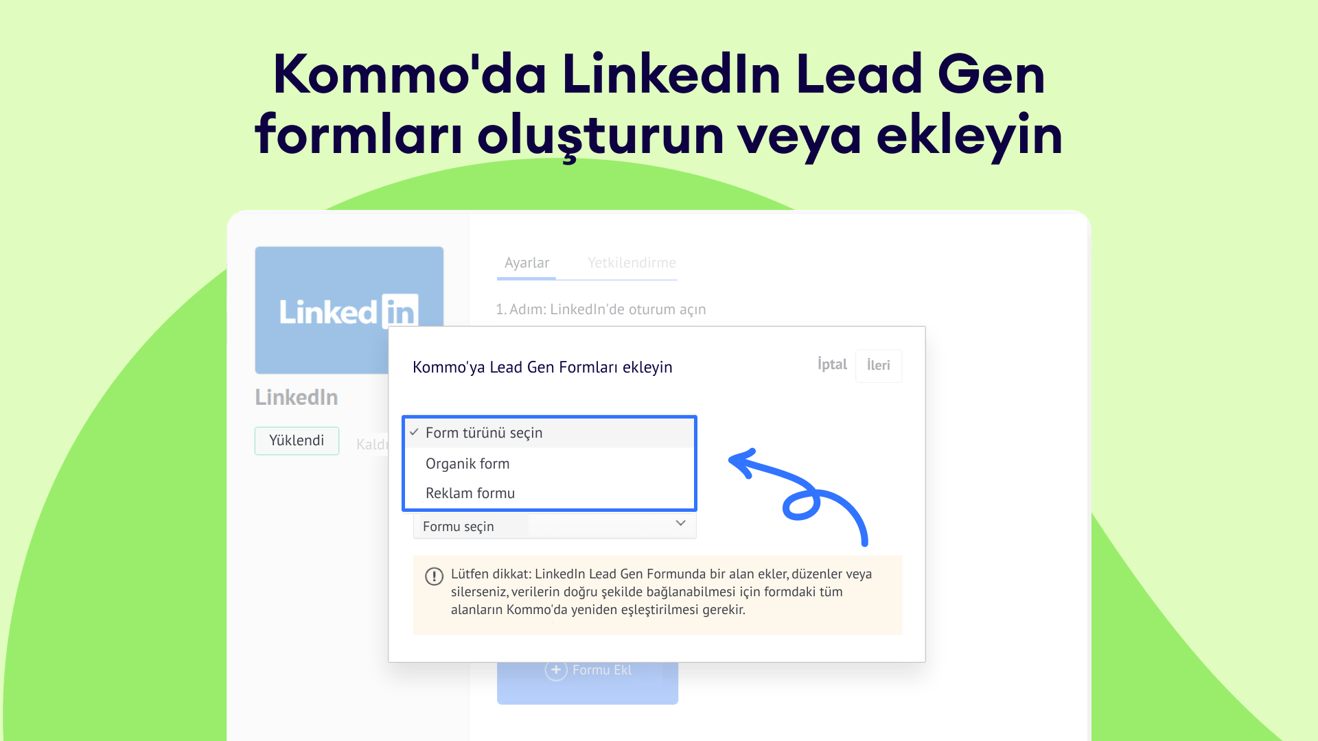 Form entegrasyonu: LinkedIn Lead Gen Formlarını Kommo'ya bağlayın, böylece reklamlarınızı veya formlarınızı dolduran potansiyel müşteriler otomatik olarak CRM'inizde görünür.