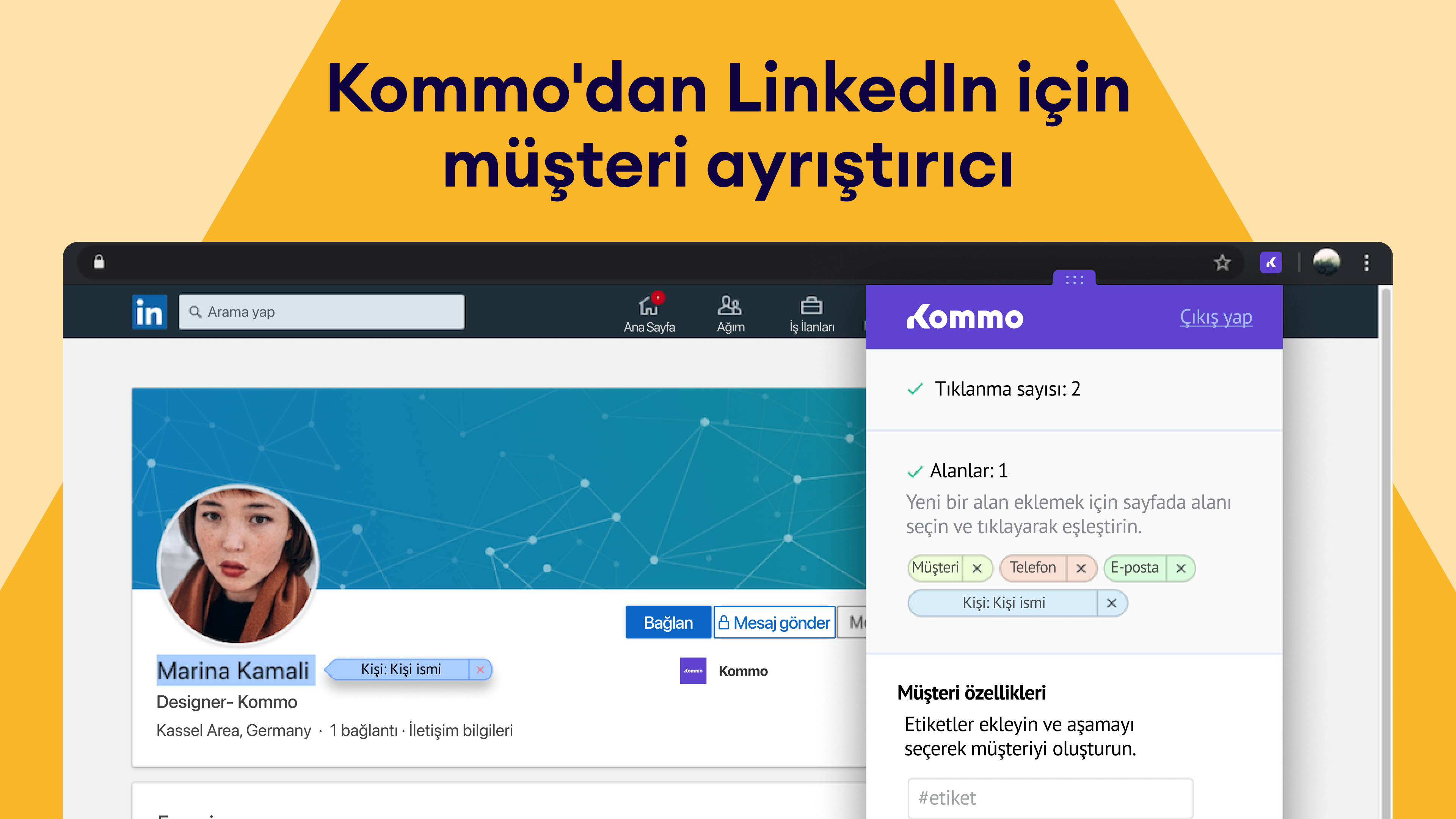 Kommo'nun LinkedIn entegrasyonu, birkaç tıklamayla LinkedIn profillerinden yeni potansiyel müşteriler oluşturmanıza olanak tanır. Müşteri bilgisi toplayıcı Chrome uzantısını kullanarak, önemli profil bilgilerini alabilir, bunları CRM alanlarınıza eşleştirebilir ve her bir kişiyi takip ve takip için doğrudan satış takip hattınıza gönderebilirsiniz. Ayrıca, LinkedIn Lead Gen Formlarını bağlayarak, reklamlardan ve formlardan potansiyel müşterileri otomatik olarak yakalayabilir ve hiçbir potansiyel müşterinin gözden kaçmamasını sağlayabilirsiniz.