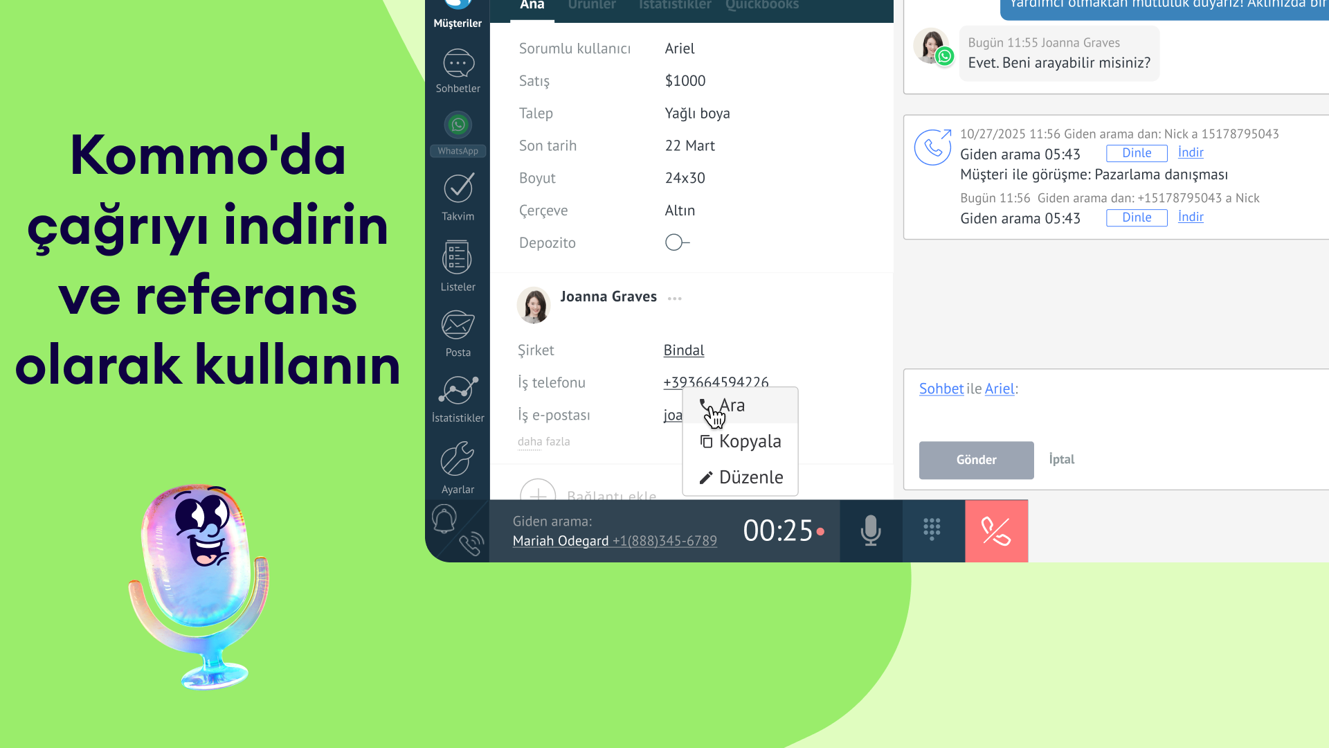 • Tıkla ve ara işlevi: Tek bir tıklama ile doğrudan müşteri kartlarından arama başlatın, manuel olarak numara çevirme ihtiyacını ortadan kaldırın.
