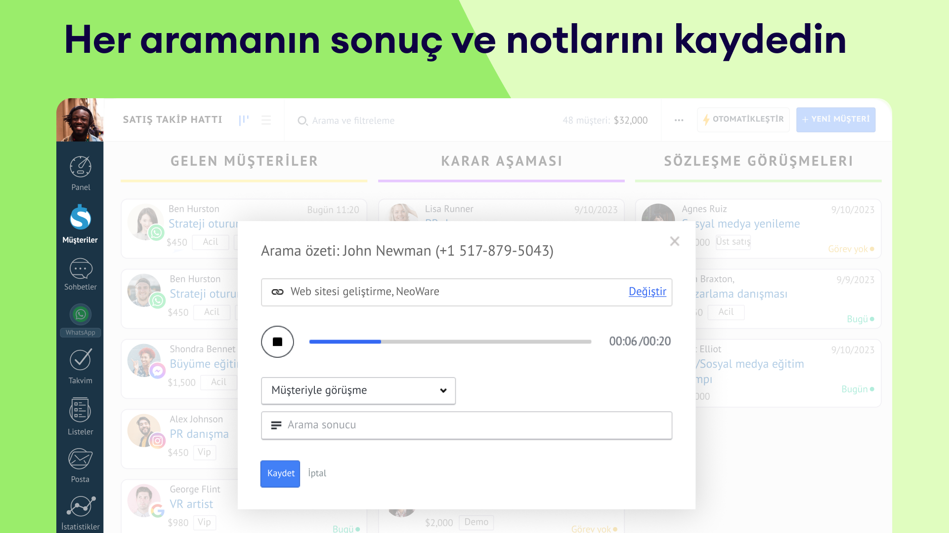 • Arama hatırlatıcıları: Takip aramaları için otomatik hatırlatıcılar ayarlayın, müşteri adaylarıyla zamanında iletişim kurun.