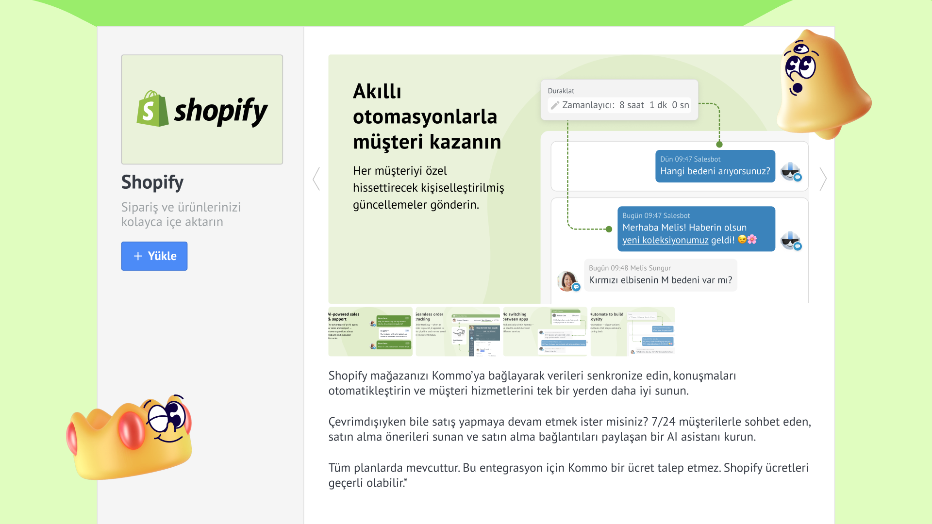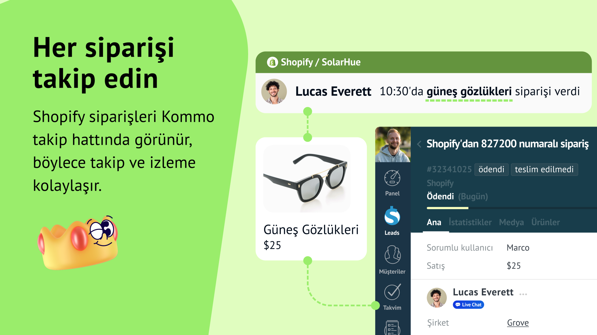 Shopify mağazanız artık Kommo ile senkronize! Ürünleriniz, siparişleriniz, kişileriniz ve işlemleriniz otomatik olarak senkronize edilecek 🎊