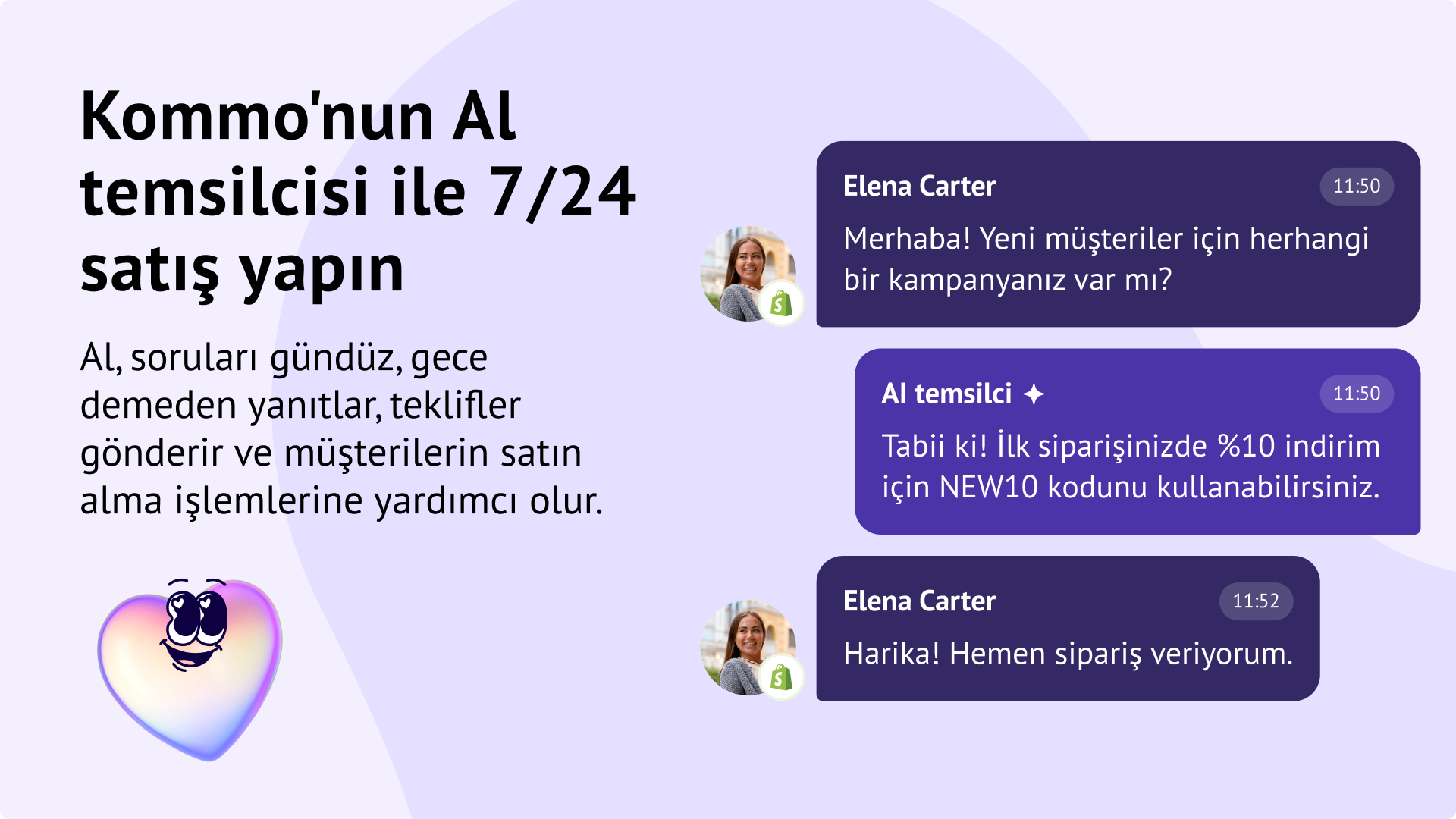 • AI destekli müşteri hizmetleri: Kommo'nun web sitesi sohbet tuşunu, Shopify mağaza verilerinize göre ürün bulunabilirliği, mağaza politikaları, sipariş takip detayları ve daha fazlası hakkında gerçek zamanlı sorularınızı yanıtlayan bir AI temsilcisiyle birlikte ekleyin.