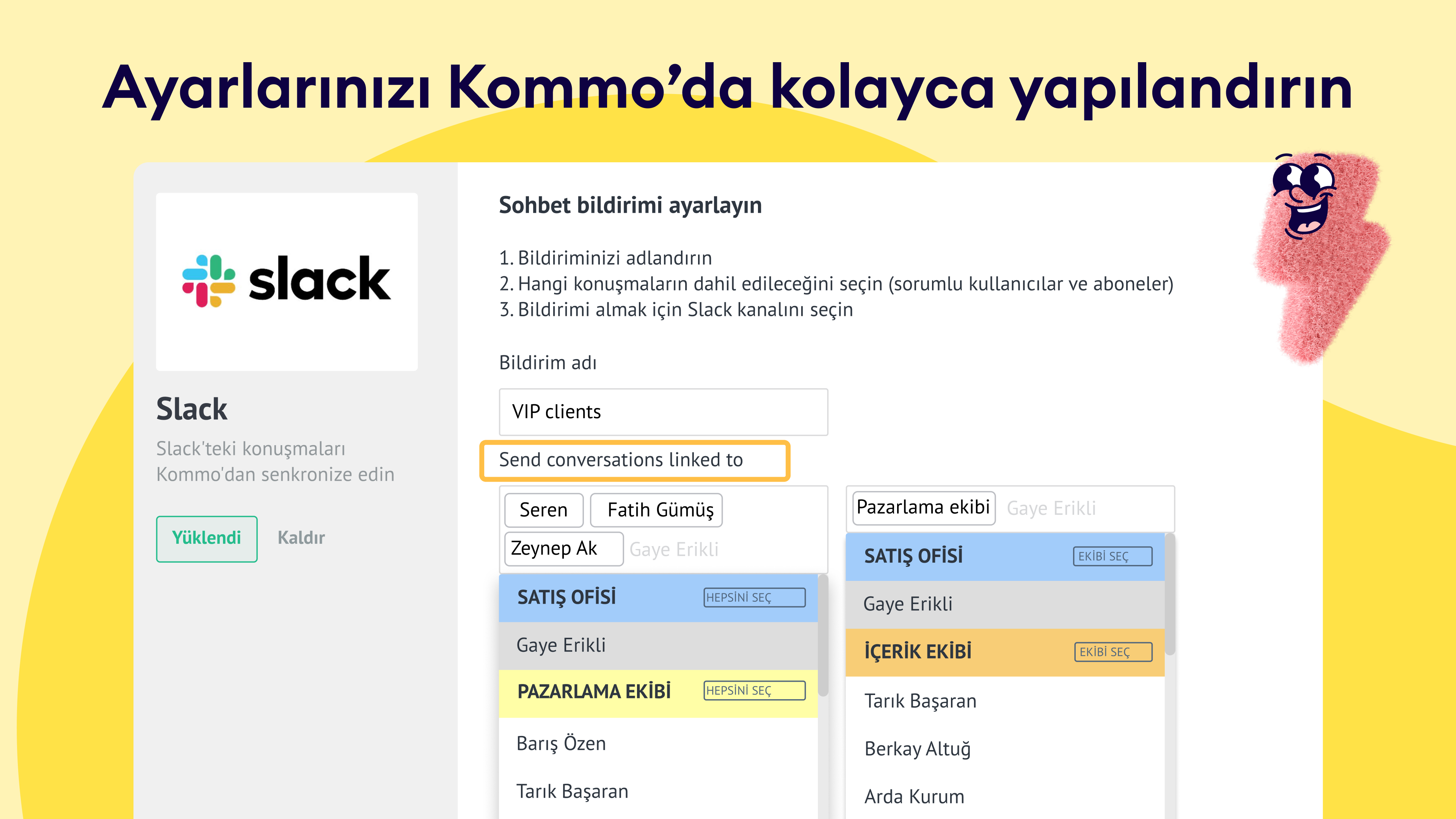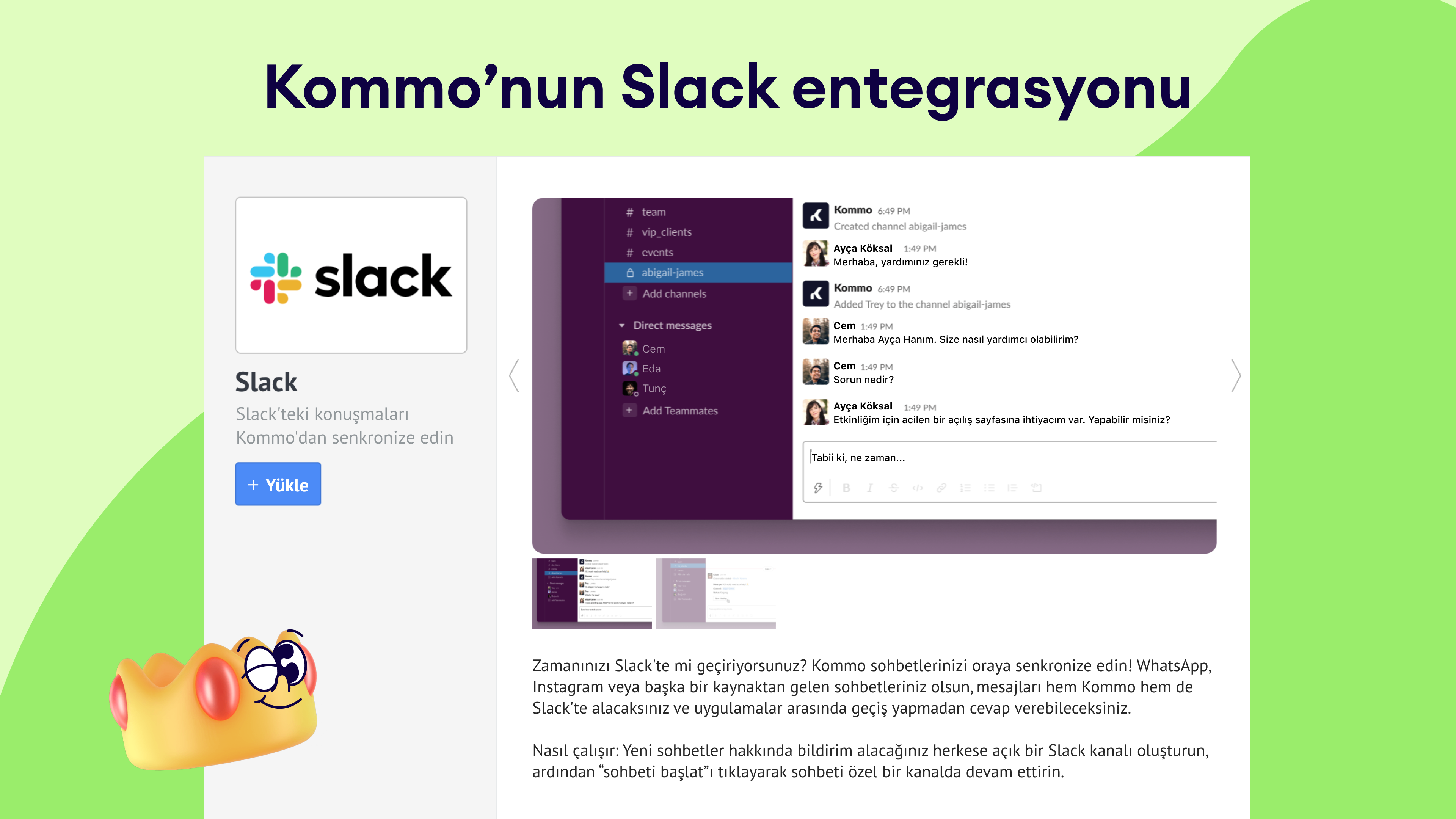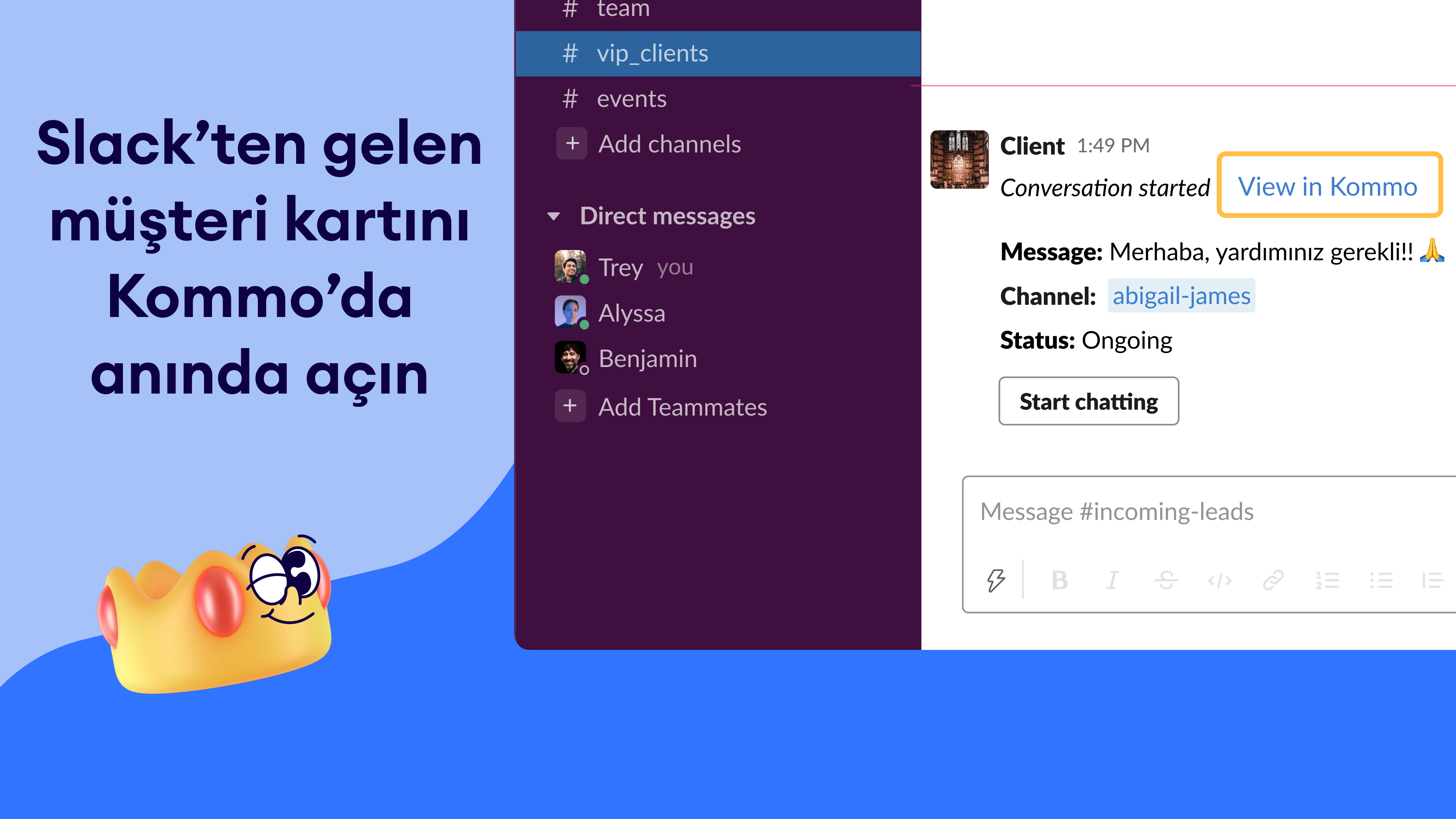 Bu entegrasyon, Kommo'yu Slack'e bağlayarak mesajların, bildirimlerin ve uyarıların doğrudan Slack kanallarınıza akmasını sağlar. Ekibinizin halihazırda kullandığı araçlar içinde iletişimi ve takip işlemlerini sorunsuz bir şekilde yönetebilirsiniz.