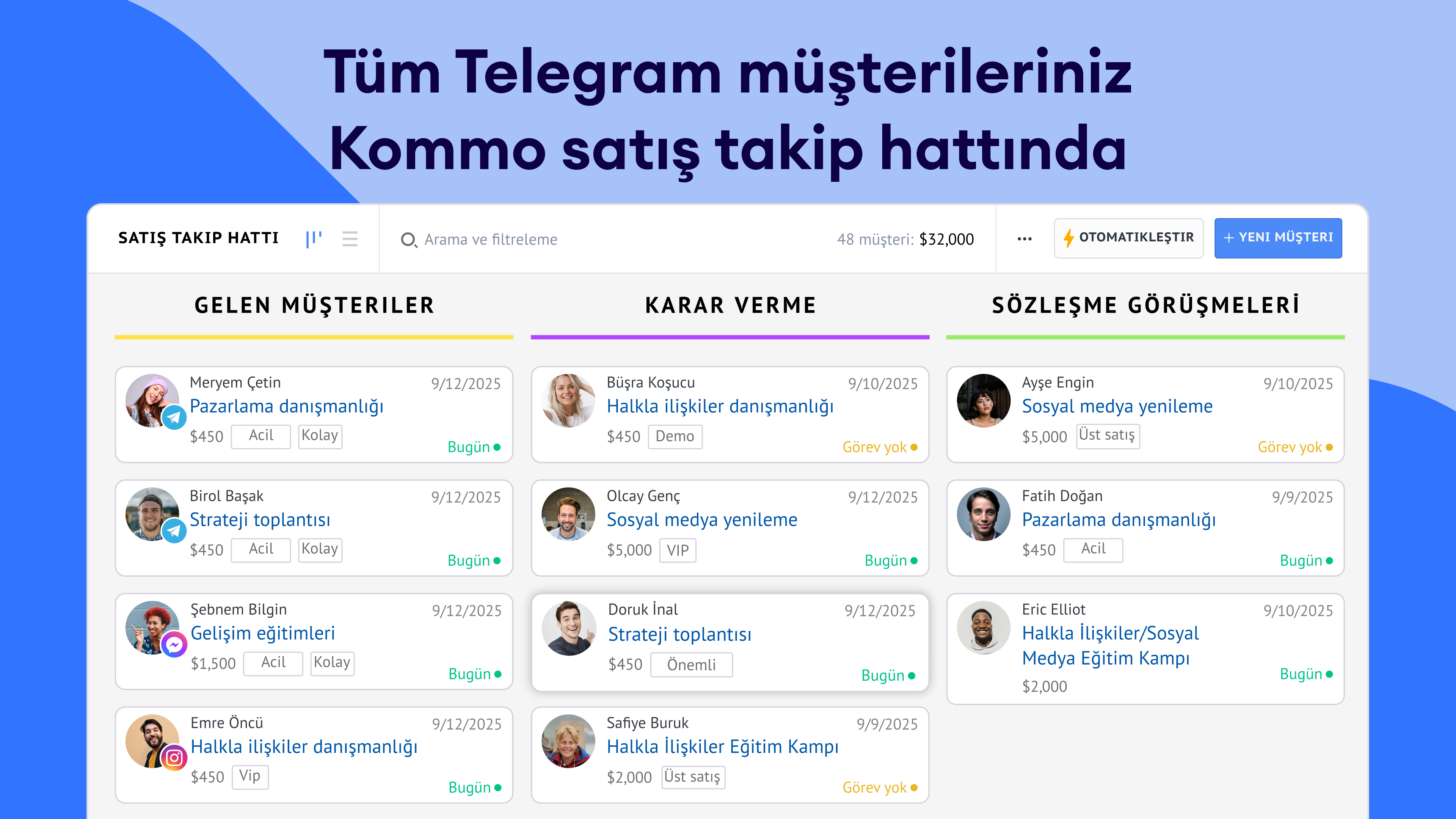 Telegram entegrasyonu, Kommo kullanıcılarına müşterilerle bağlantıda kalmak için güvenli ve hızlı bir yol sunar. Kommo'nun görsel satış takip hattı, Salesbot ve otomasyon özellikleriyle birleştirildiğinde, Telegram'ı basit mesajlaşmanın ötesine taşır ve onu potansiyel müşterileri yakalayan, potansiyel müşterilerle etkileşim kuran ve Kommo içinde iletişimi 7/24 yapılandırılmış halde tutan bir ticari kanal haline getirir.