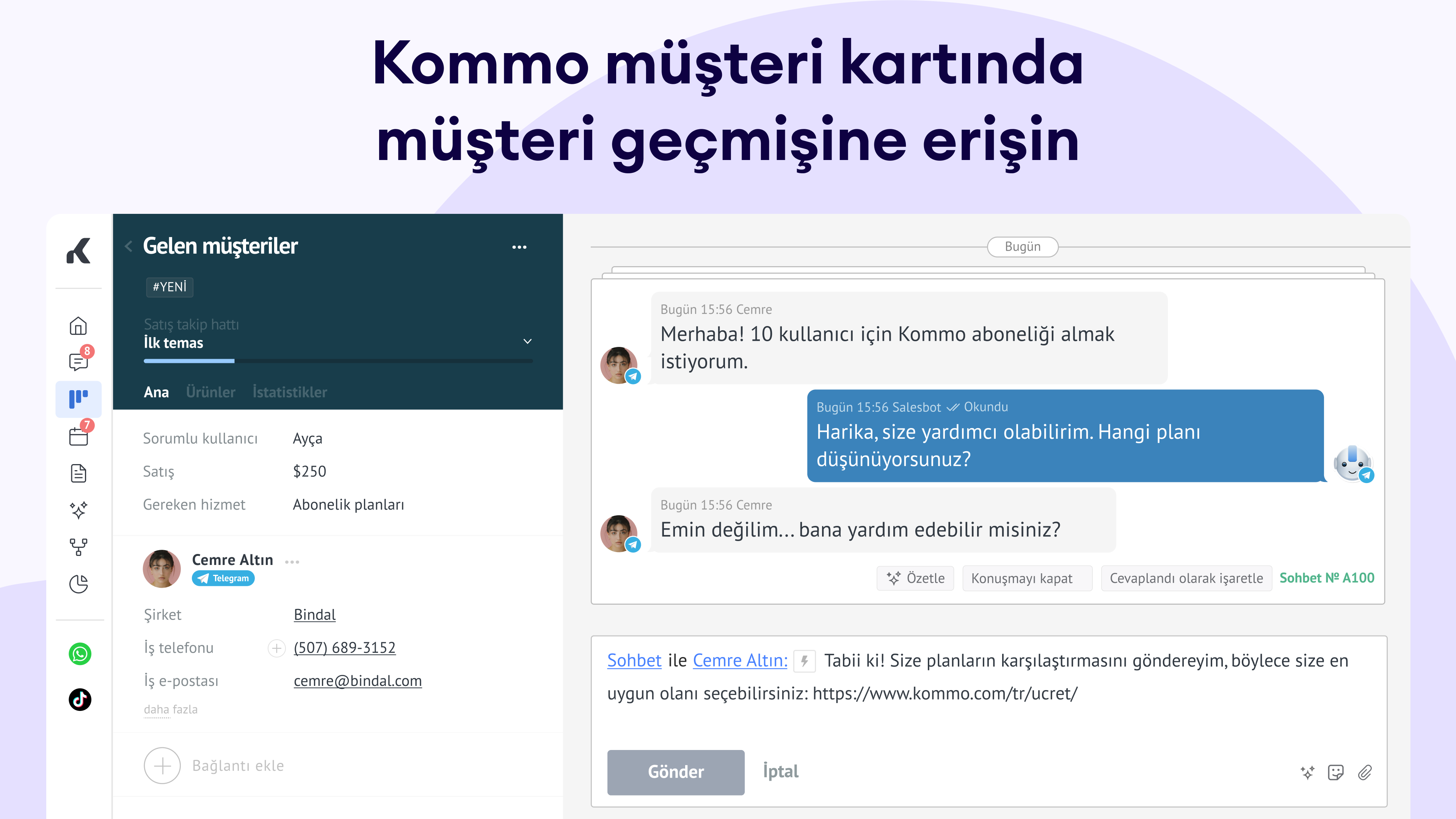 • Sohbet geçmişi: Tüm konuşmaları CRM'inizde kaydedin ve erişilebilir tutun.