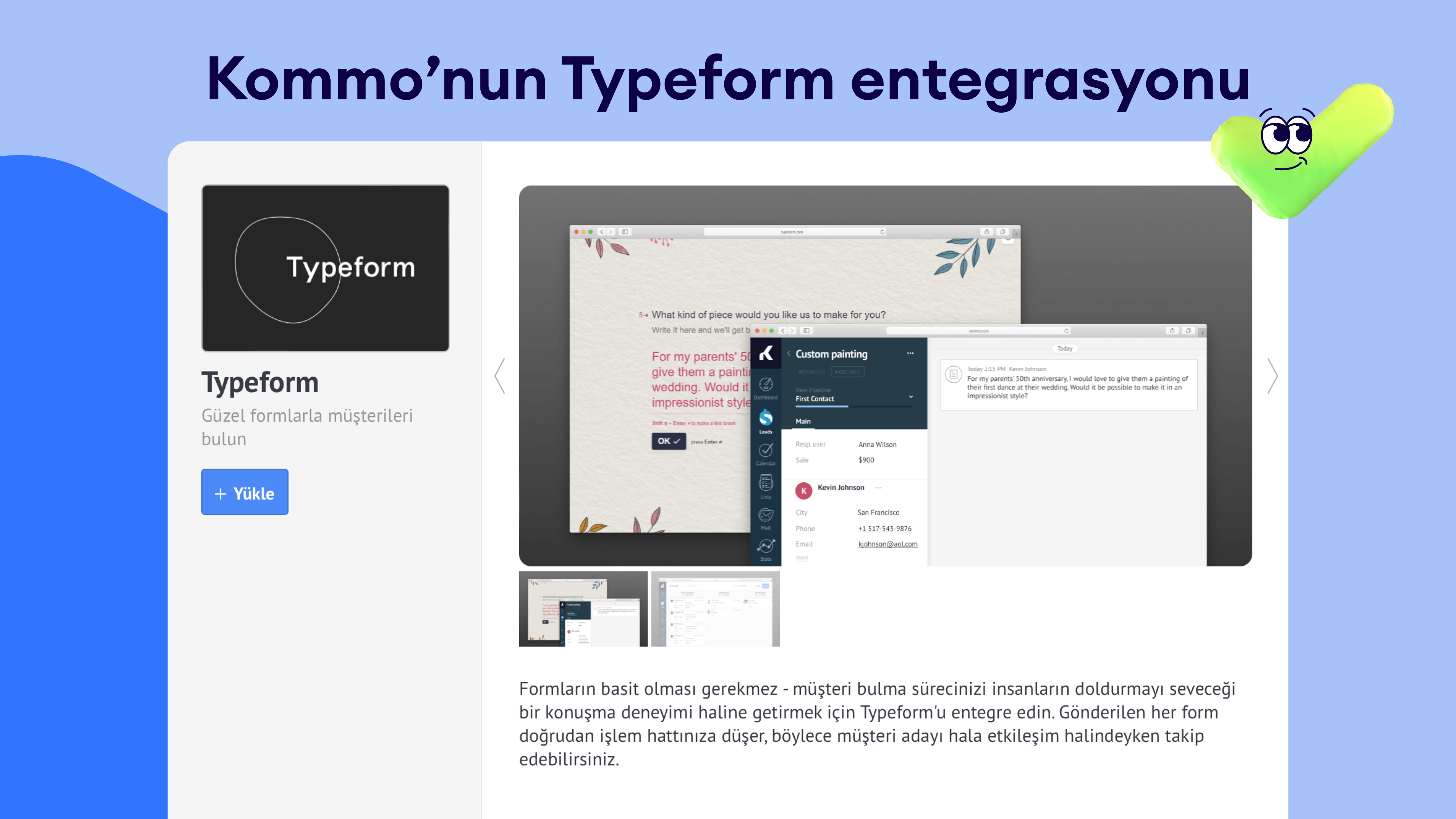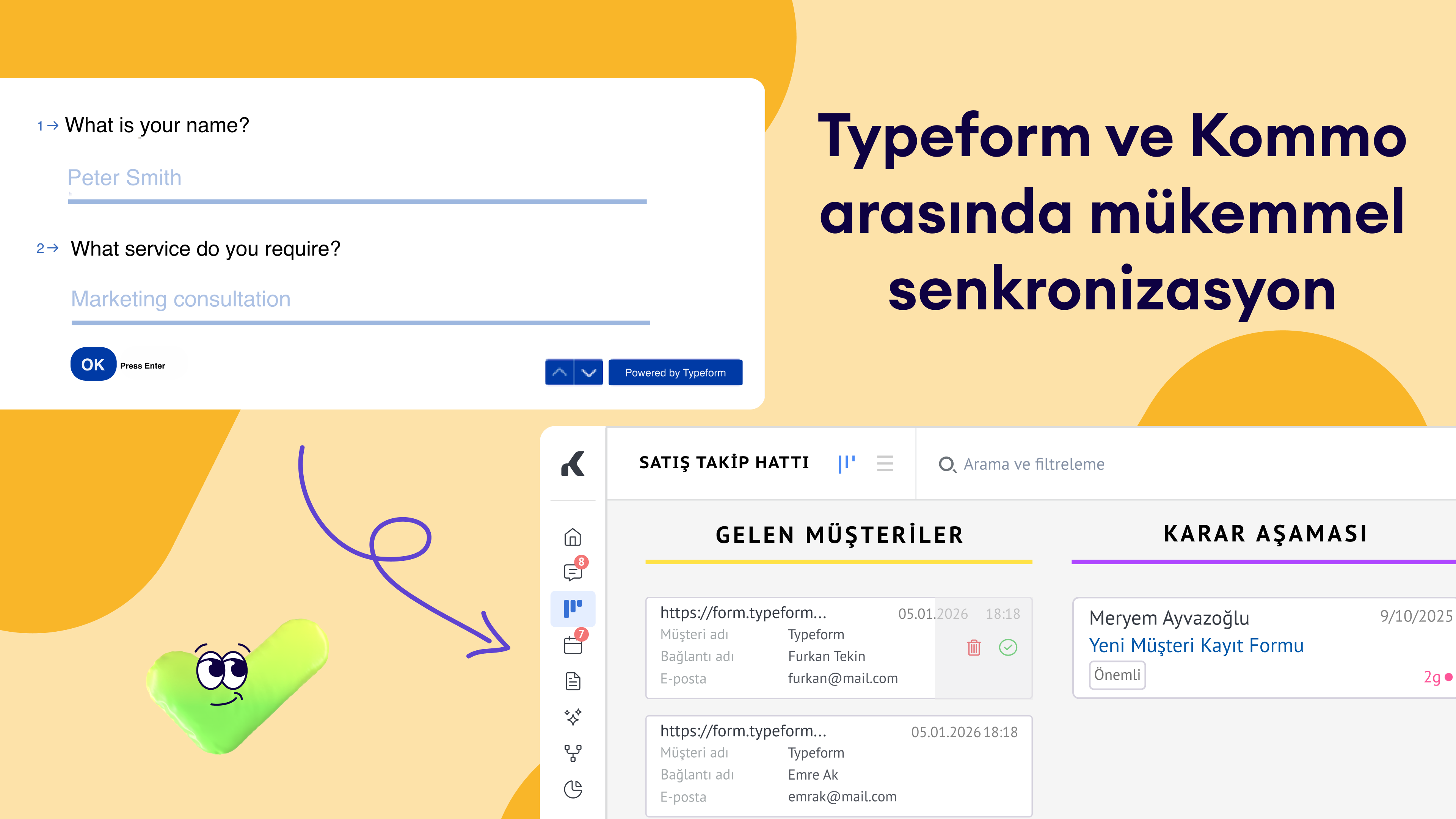 Kommo'nun Typeform entegrasyonu, form yanıtlarını CRM'inizdeki müşterilere otomatik olarak dönüştürerek sorunsuz bir müşteri yakalama süreci sağlar. Typeform'u bağlayarak satış takip hattınızı kolaylaştırabilir, her form gönderiminin hızlı bir şekilde takip edilmesini ve verimli bir şekilde yönetilmesini sağlayabilirsiniz. Bu entegrasyon, potansiyel müşteri yönetimi sürecinizi geliştirir, manuel veri girişini azaltır ve satış döngünüzü hızlandırır.